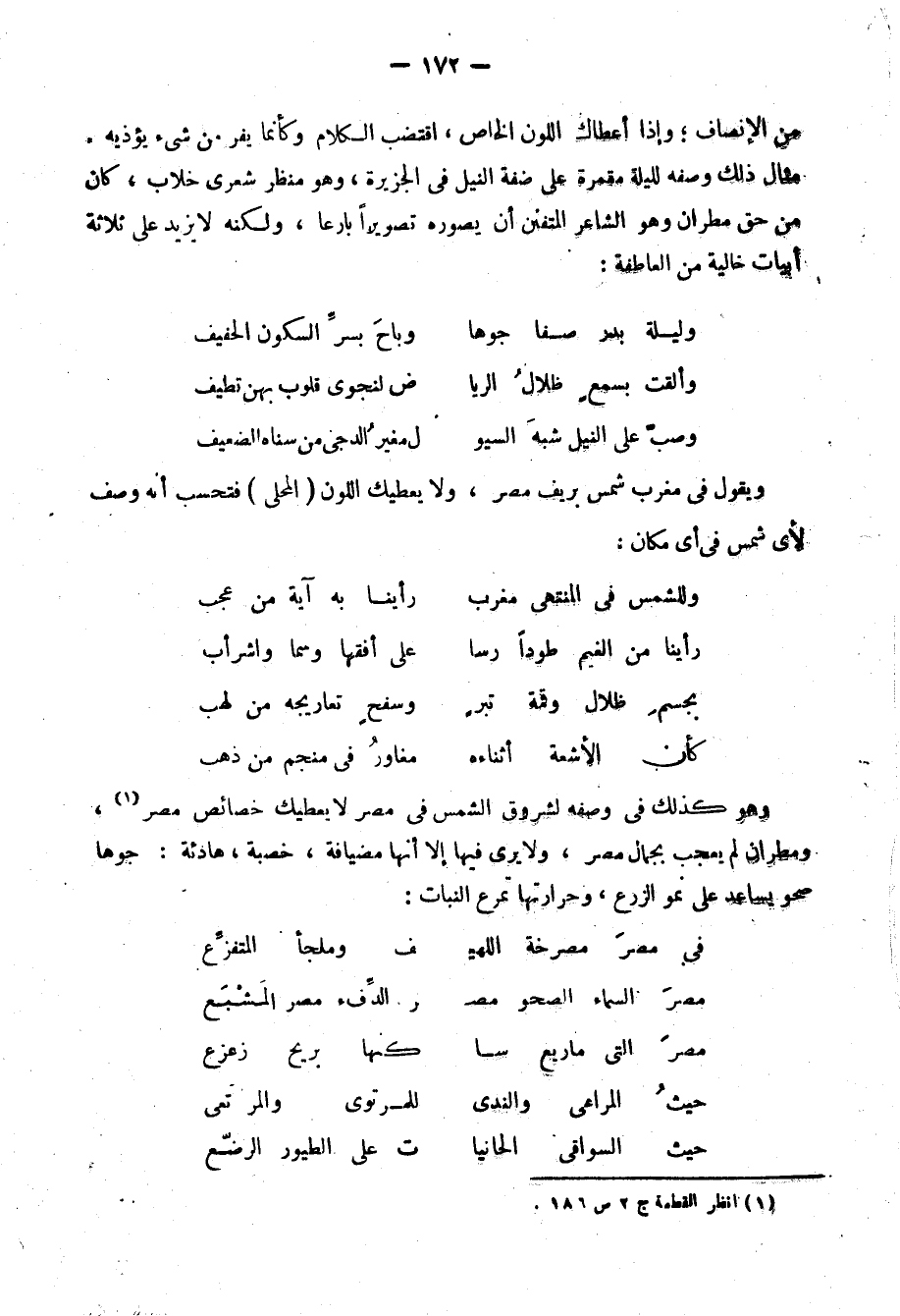 وقد وفينا البارودي حقه من الدرس في الجزء الأول من كتابنا، فلا داعي للتكرار، ولكننا نقول إنه أول من فطن في العصر الحديث لجمال مصر، وتغنى به في شعره؛ وإذا نظرنا إلى الشعراء بعده نجدهم يتفاوتون في هذا الباب، فإسماعيل صبري على الرغم من رقة حسه، ودقة ذوقه، وإرهاف شعوره؛