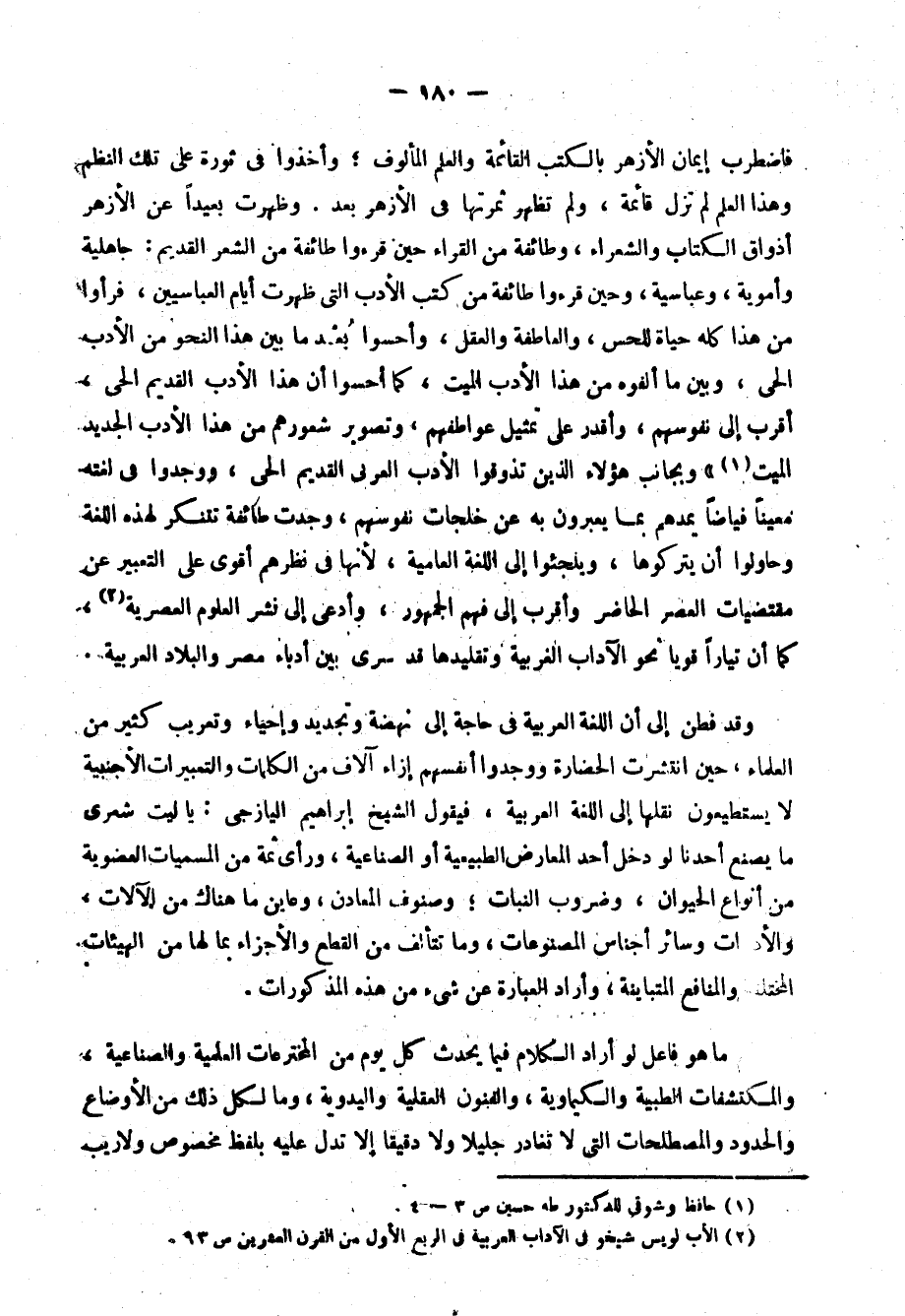 فهو ينظر إلى الدنيا وما فيها بمنظار أسود يحيل الجميل دميمًا، والمناظر الأنيقة الفتانة رديئة كثيبة، وليس العيب عيب الطبيعة، ولكنه عيب من ينظر إليها. ومطران في أحسن حالاته حين يصف الطبيعة المصرية تراه مبهمًا، لا يعطي اللون الخاص الذي يميز مصر عن سواها، وكأنما ينظر إلى شيء آخر غير مصر حين يصف منظرًا وصفًا فيه شيء من الإنصاف؛ وإذا أعطاك اللون الخاص، اقتضب الكلام وكأنما يفر من شيء يؤذيه. مثال ذلك وصفه لليلة مقمرة على ضفة النيل في الجزية، وهو منظر شعري خلاب، وكان من حق مطران وهو الشاعر المتفنن أن يصوره تصويرًا بارعًا، ولكنه لا يزيد عن ثلاثة أبيات خالية من العاطفة: