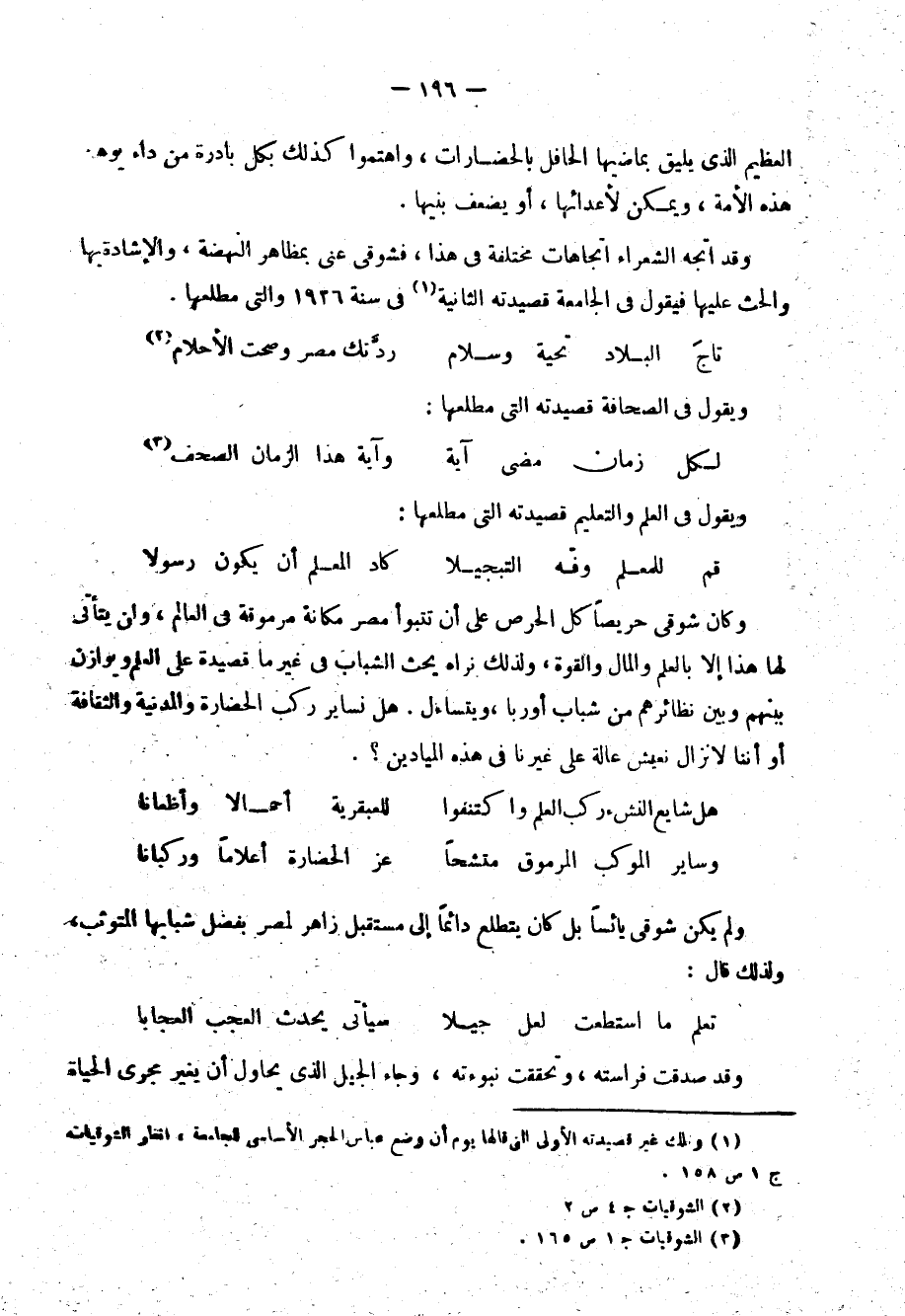 ولقد تأثرت مصر بهذه النزعة، ونعلم أن الثورة العرابية قد تطورت إلى المطالبة بالحكم النيابي ورفع الضيم عن الشعب، ولا ننسى حملة جمال الدين وصحبه علي إسماعيل، ثم علي توفيق، وقد رأينا كيف عم الفرح بلاد العرب والإسلام حين أعلنت تركيا الدستور في سنة 1908، جهر شاعر مثل إسماعيل صبري بأن مصر لا بد أن تنال مثل ما نالت تركيا، وناشد عباسًا أن يعطي مصر نصيبها في الحكم النيابي، وجاهد مصطفى كامل ومحمد فريد، ورجال الحزب الوطني في أن يمصروا التعليم ويحافظوا على اللغة العربية، وعلى مظاهر القومية في الثقافة كما رأينا آنفًا، وأسهم الشعراء والأدباء في الحث على ذلك.