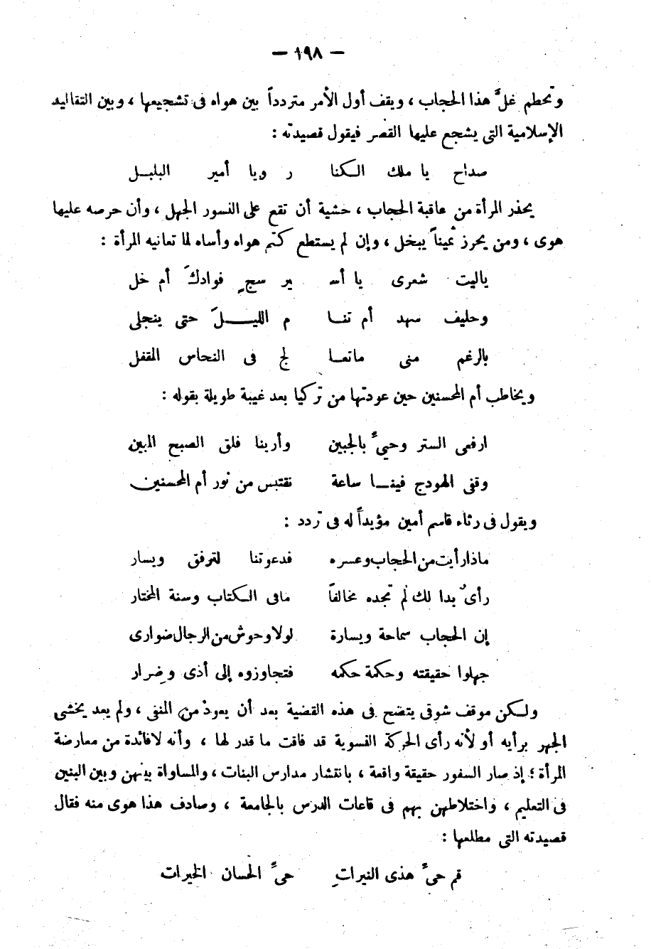 ولا يكتفي بهذا في الحض على مساعدة الأطفال البائسين، والعمل على النهوض بهم، بل يأسى لما يلاقيه الشعب من غلاء، لا يكتوي به إلا ذوو المورد المحدود، والذين يكدحون في سبيل الرزق، وتتصبب جباههم عرقًا إبان العمل،