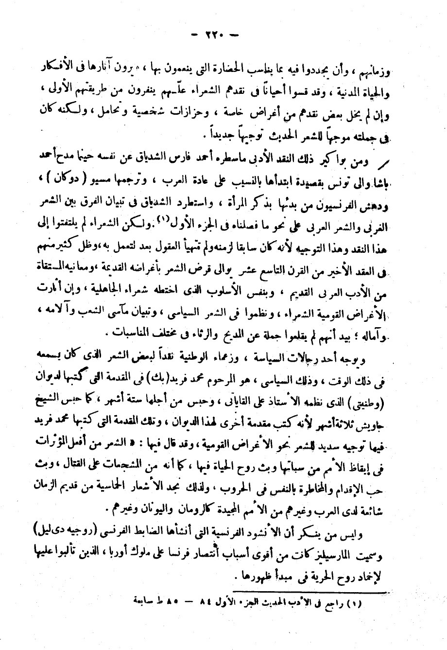 وقد لا يرضى عن ذلك أصحاب المدرسة الجديدة، ولكنهم على الرغم منهم اضطروا إلى مشاركة الأمة في عواطفها، وإلى تغذية هذه العاطفة، وقد لا يكون هذا النوع من الشعر جاريًا على نمط الشعر الغربي الحديث، ولكنا أمة لها ظروفها الخاصة، وفي يده نهضة عامة شاملة، وفي أمس الحاجة إلى من يشجع المكافحين في سبيل مجدها أحياء، ويجعلهم مثلًا طيبًا لمن بعدهم أمواتًا.