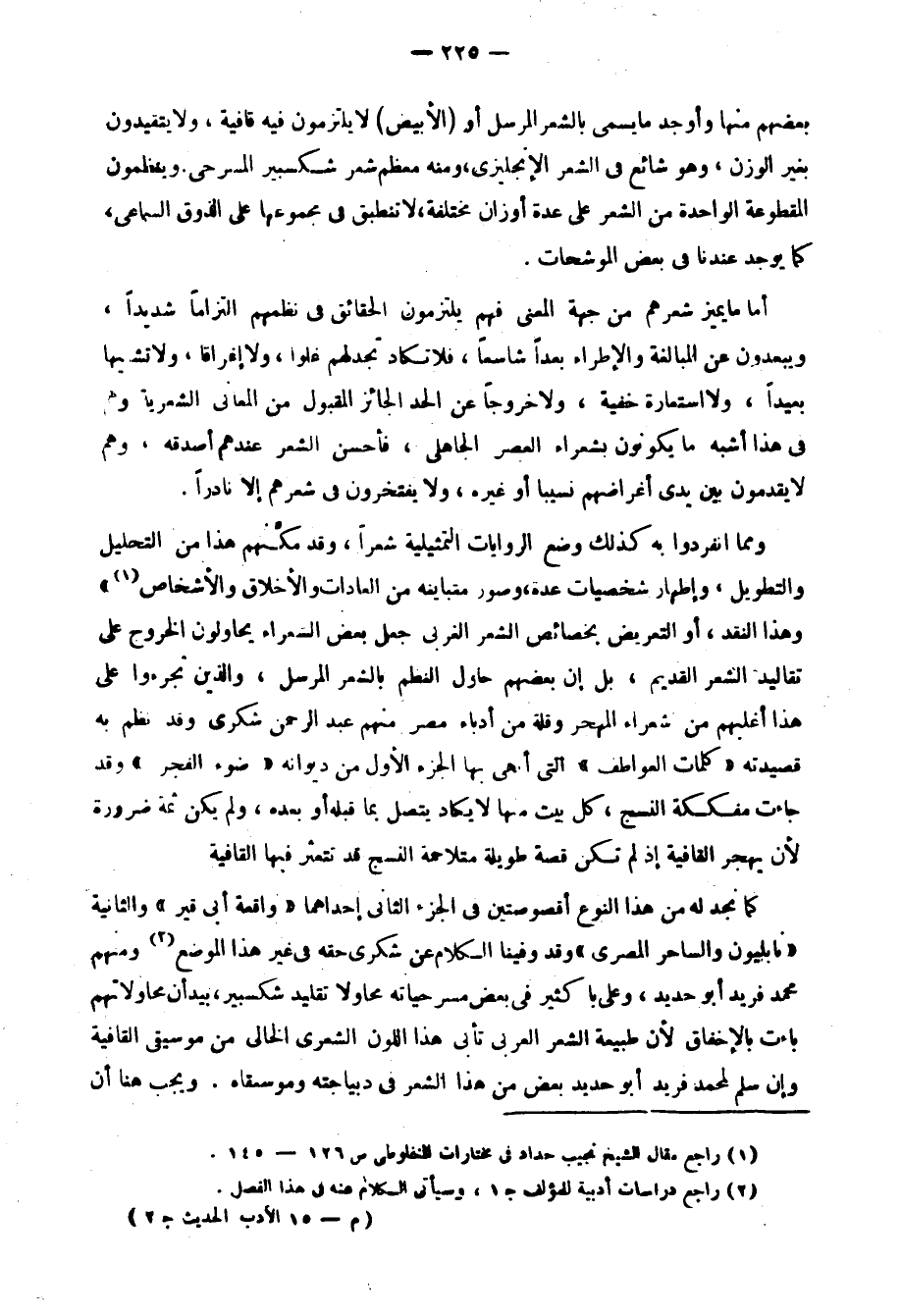 وقد اشتهر من النقاد الذين سلكوا مسلك السلف في النظرة إلى الشعر وطبقوا قواعد البلاغة القديمة في النقد: إبراهيم المويلحي، ولم يروجوا في نقدم لمذاهب جديدة في الأدب، أو ينموا على تأثر بتيارات الأدب الغربي وإنما ينظرون إلى اللفظ من حيث جودته وصحته وعدم تعاضل حروفه وانسجامه مع غيره وأدائه للمعنى، وينظرون إلى المعنى من حيث الإحالة والتعسف والخطأ والوهم