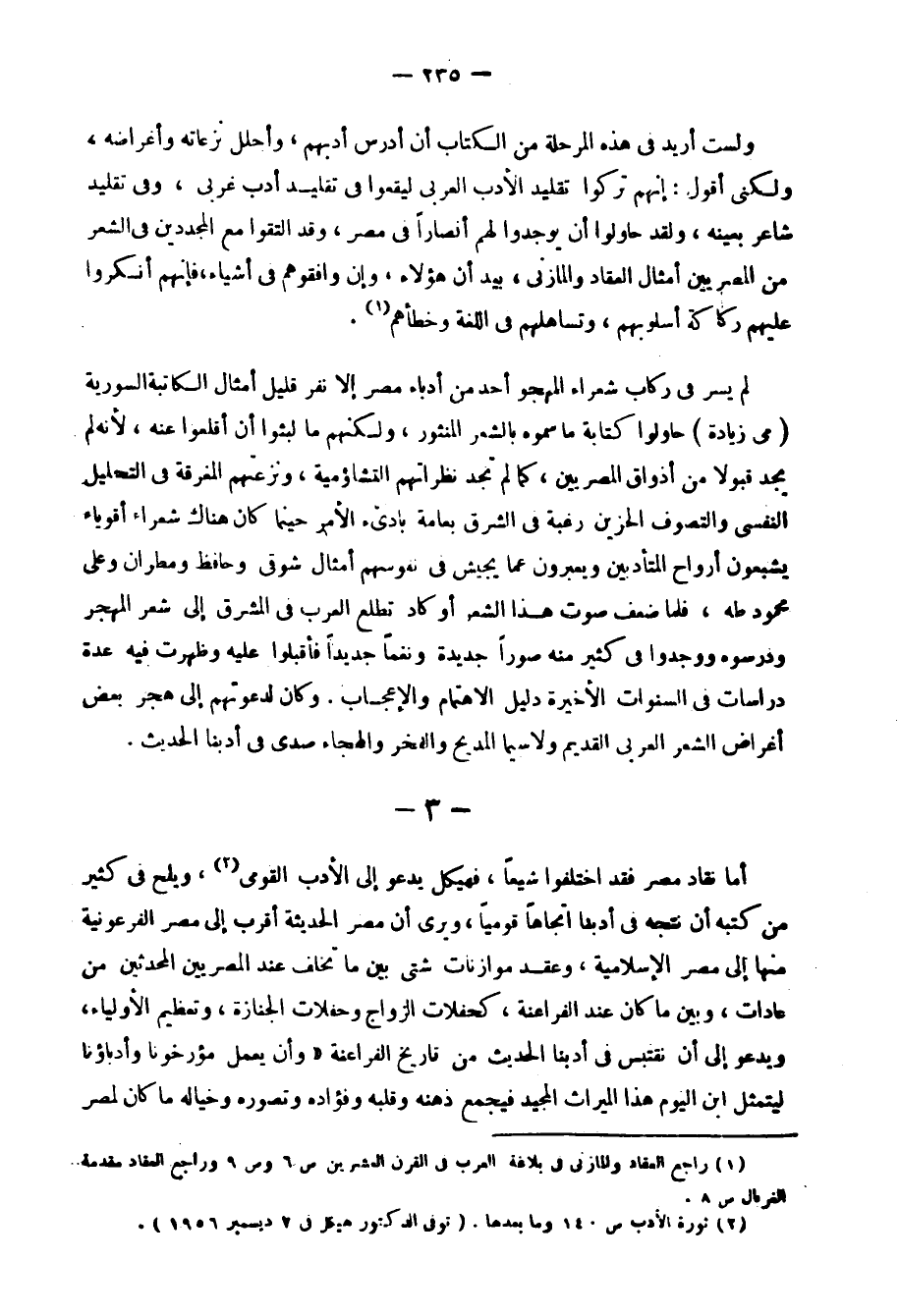تأثير بعض نقادنا بكبار الأباء الأوربيين الذين لم يشاهدوا تلك الحركات الهداية لمعنويات البشرية وحضارتها، ورجعوا يدعون قومهم إلى أن يجددوا في أدبهم، وأن يجعلوه ممثلًا لعصرهم وبيئتهم والحضارة التي يتقلبون في أحضانها. دعوا إلى الثورة في الأدب شعرًا ونثرًا، والذي يعنينا الآن هو الشعر، فلم تكن الثورة على الغرض وحده كما رأيت عند محمد فريد، ولكن الثورة كانت على لغته، وعلى أسلوبه، وعلى معانيه، وعلى أغراضه، وأن نقتفي في شعرنا آثار الشعر الغربي في كل هذا.