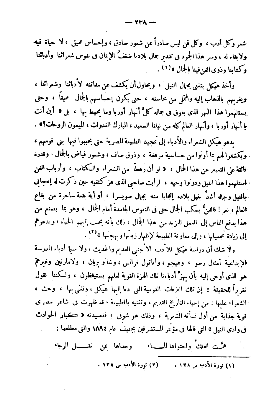 وهذه الطريقة استعارها على ظننا الكتبة المحدثون كأمين الريحاني، وجبران خليل جبران، ومن جرى مجراها من الكتبة الغربيين، ولا سيما الإنكليز في ما يدعونه بالشعر "الأبيض" غير المقفى، وفي بعض كتاباتهم الشعرية المعاني غير المقيدة بالأوزان ولسنا نفي هذه الطريقة الكتابية التي تخلو من مسحة الجمال في بعض الظروف، اللهم إلا إذا روعي فيها الذوق الصحيح، ولم يفرط في الاتساع فيها فتصبح لغطًا وثرثرة. على أننا كثيرًا ما لقينا في هذا الشعر المنثور قشرة مزوقة ليس تحتها لباب، وربما قفز صاحبها من معنى لطيف إلى قول بذيء سخيف، أو كرر الألفاظ دون جدوى، بل بتعسف ظاهر ومن هذا الشكل كثير من المروحين للشعر المنثور من مصنفات الريحاني، وجبران، وتبعتهما، فلا تكاد تجد في كتاباتهم شيئًا مما تصبو إليه النفس للشعر الموزون الحر، من رقة شعور وتأثير. خذ مثلًا وصف الريحاني للثورة: