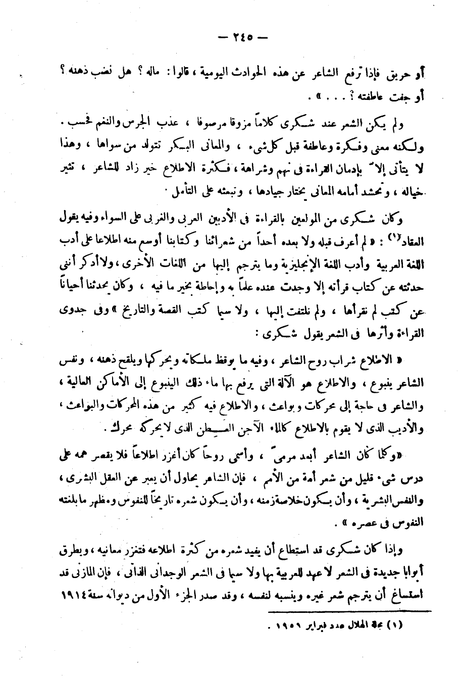 ويتسم الشعر المهجري -بعامة: شماليه وجنوبيه- بهذه الحرية في التعبير وبالتأمل في الكون وفي الإنسان فردًا وفي المجتمع وفي الطبيعة وفي حقيقة الوجود والبحث عنها، وفي النزعات التصوفية عند اشتداد الأزمات النفسية.