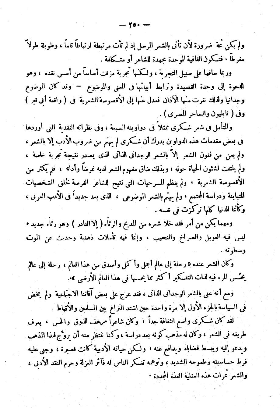 فياض بالجمال، وقدرة فائقة على التعبير عن هذا الجمال، "لو أن رهطًا من الشعراء والكتاب، وأرباب الفن استلهموا هذا النيل ودونوا وحيه، لرأيت صاحبي الذي هز كتفيه حين ذكرت له إعجابي بالنيل وجماله أشد بنيل بلاده إعجابًا منه بجمال سويسرا، أو أية بقعة ساحرة من بقاع العالم، نعم! فالفن يسكب الجمال في النفوس الجامدة أمام الجمال، وهو بمال يصنع من هذا يدفع الناس إلى العمل للمزيد من هذا الجمال، وذلك بأنه يحبب إليهم الحياة، ويدعوهم إلى زيادة تجميلها، وإلى معاونة الطبيعة فظهار زينتها وبهجتها"1.