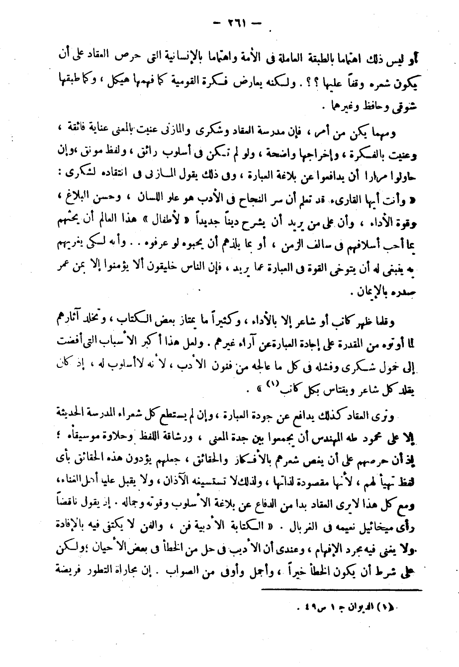 وقد قلنا في غير هذا الكتاب1 تعليقًا على رأي شكري هذا: "وهذه الدعوة إلى وحدة القصيدة ثورة على نظام الشعر العربي الذي كان البيت فيه وحدة مستقلة، ولكننا نلاحظ أن شكري لم يتطرف في دعوته مثلما تطرف العقاد من بعد، حين دعا إلى الوحدة العضوية وإلى أن القصيدة بنية حية؛ وكل الذي أراده شكري ألا يكون البيت خارجًا في معناه عن موضوع القصيدة، أي أن القصيدة تكون كلها ذات موضوع واحد، لا عددًا من الموضوعات، كما كانت القصيدة العربية التي وضع أسسها الجاهليون.