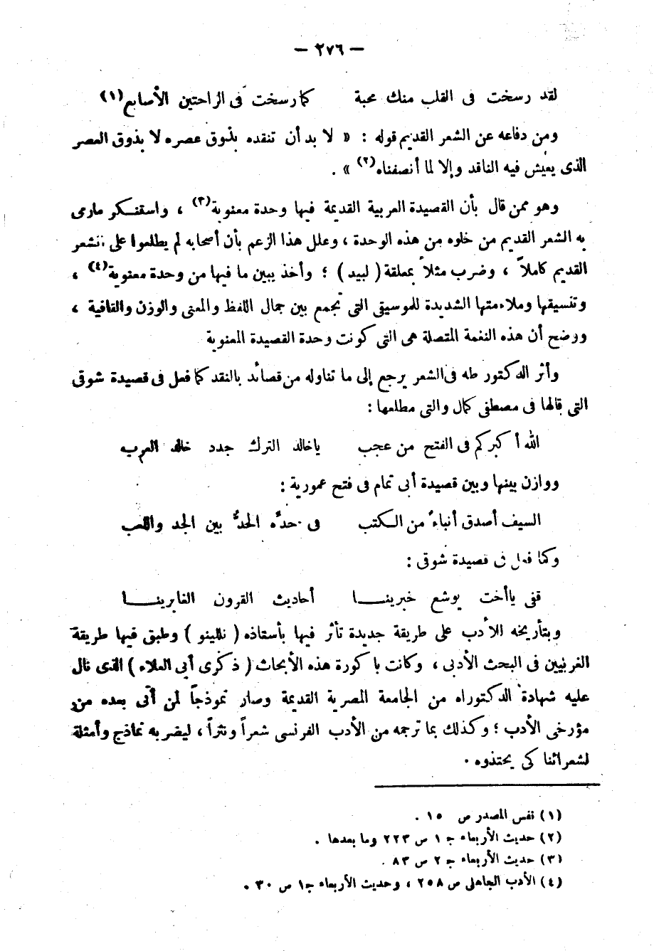 "أولها": أن الشعر قيمة إنسانية، وليس بقيمة لسانية؛ لأنه وجد عند كل قبيل، وبين الناطقين بكل لسان، فإذا جادت القصيدة من الشعر فهي جيدة في كل لغة، وإذا ترجمت القصيدة المطبوعة لم تفقد مزاياها الشعرية بالترجمة إلا على فرض واحد، وهو أن المترجم لا يساوي الناظم في نفسه وموسيقاه، ولكنه إذا ساواه في هذه القدرة لم تفقد القصيدة مزية من مزاياها المطبوعة أو المصنوعة، كما نرى في ترجمة "فتزجيرالد" لرباعيات الخيام.