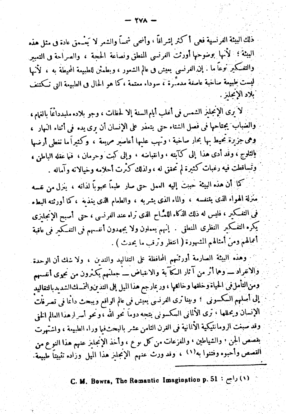 أما إذا أعجب بشخص فهو يتجاوز عن سيئاته، بل يلتمس له المعازير ويبالغ في تصوير حسناته كما فعل مع ابن الرومي، فدافع عن تشاؤمه وسخريته، عازيًا نقمته على العصر وأبنائه إلى ذكاء الشاعر وفرط حساسيته، حتى لكأنه يحس الحياة بأعصابه، يحس ما فيها من الظلم والغبن والخلط والفساد والتناقص، وإحساسه هذا بثقل القيود المحيطة به أبرز "أنا" في شعره وفي حياته إلى المكان الأول من الواعية، فحفل شعره بذكر نفسه. واكتظ بالمقابلة بين الرغبة والإمكان، وبين الأمل والواقع، والذاتية إنما يبرزها إدراك حدودها والتصادم بما هو خارج عنها.