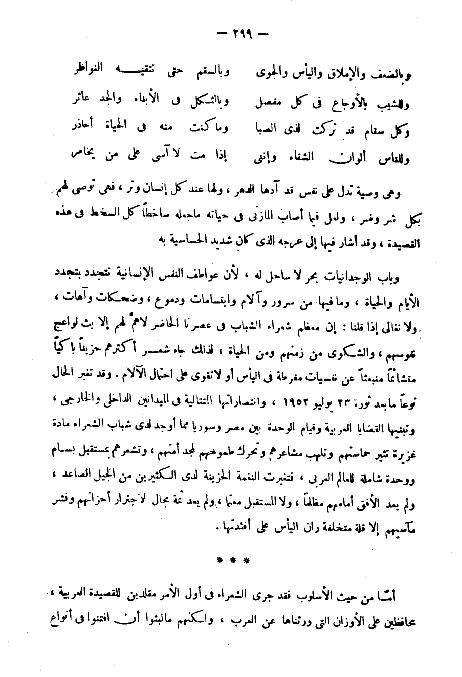 ورأى أن الشعر لا يتسع لبسط المعاني، فإذا بسطت فيه وشرحت سقطت مرتبته من الشعر وأصبح نظامًا كنظم المتون3 ودعا الرافعي4 إلى الاهتمام بجوهر الشعر وروحه لا إلى قشوره وظواهره، وأن تكون نظرة الشعراء شاملة لا جزئية. وذم التكلف الذي يفرض فيه الفكر على الإرادة، والإرادة على العاطفة، فلا تصدق العاطفة، ولا تخلو من الغلو، وذم كذلك التكلف الذي يأتي من عبادة الأوزان، وتقليد القدماء في صورهم ومعانيهم.