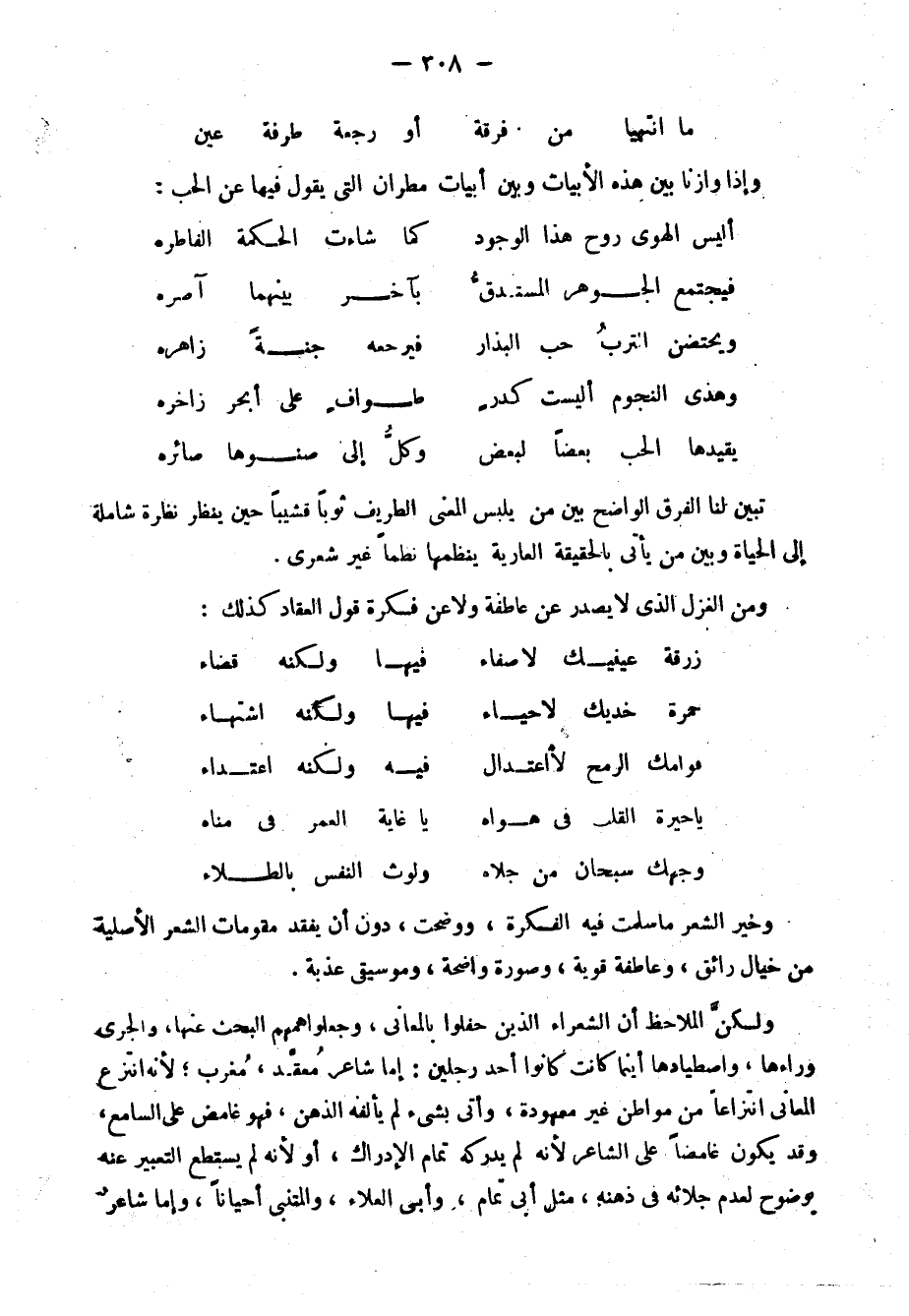 ومنهم عبد الرحمن شكري وكان بئيسًا في حبه كثير الشكوى والوله فيه معانٍ جديدة وطريفة، من ذلك قوله: