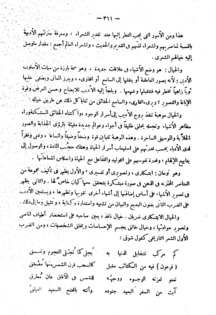 روحًا حية، ويكتنه أسرارها ويغوص في أعماقها، ويصورها ملونة بعاطفته الخاصة، وحسبما يوحي إليه خياله المجنح فينطقها، ويشخصها كوصف شوقي لرحلة في قصيدته المشهورة: