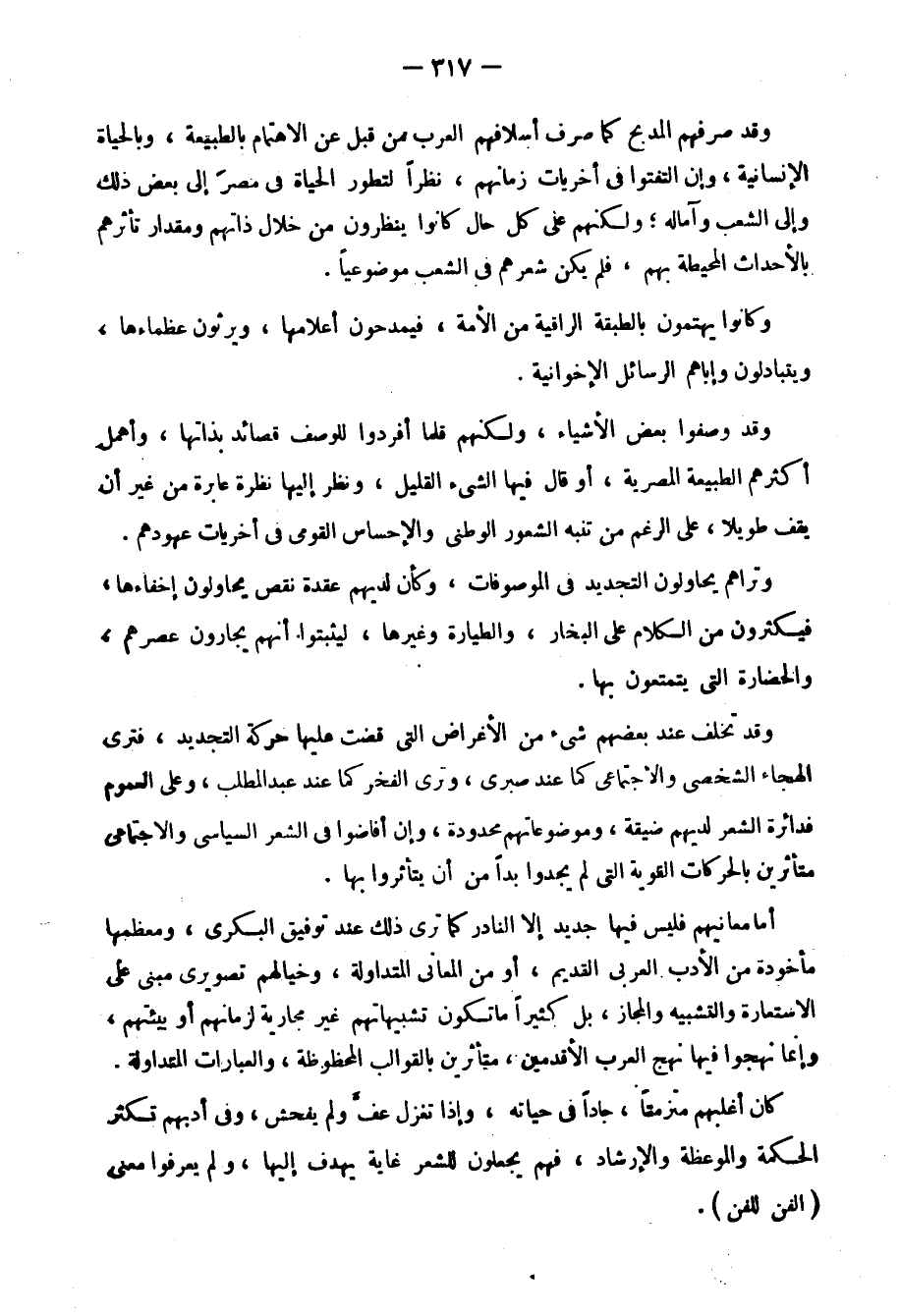 ولما اشتد تأثرهم بالأدب الغربي في القرن العشرين أخذوا ينظمون القصيدة مقطعات، تختلف في عدد أبياتها حينًا، وتتفق حينًا آخر، ولكل مقطعة قافية تستقل بها عن أخواتها. ومنهم من جرى على أسلوب الشعر الغربي في تثنية قوافيه، وتقطيعه وتفصيله، وآثر البحور الخفيفة الرشيقة، ومنهم من أهمل