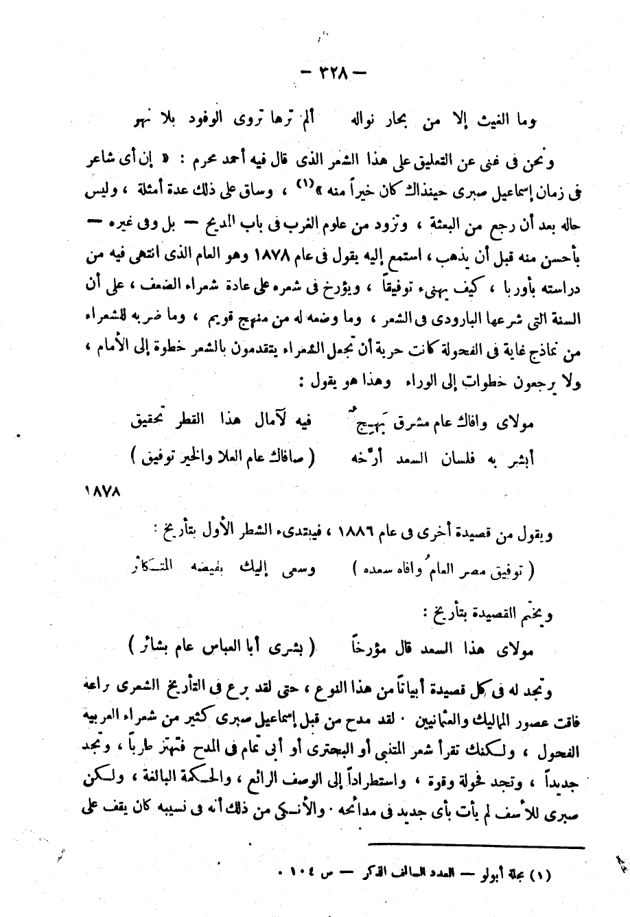 وأنت ترى إسماعيل صبري سار في إثر المتنبي، وقصر عنه، والمعنى الذي أورده المتنبي في بيت واحد قوي الديباجة، يأتي به صبري في بيتين ولم يوفه، وقد وقع شوقي، وصبري، وحافظ وغيرهم في هذه المؤاخذات3 ولا سيما في