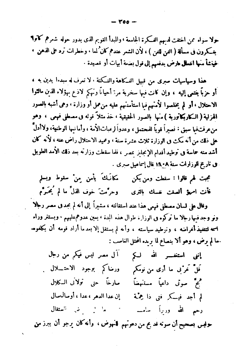 وماذا عساي أقول في شعر صبري في المديح، وهو تقليد في موضوعه، وتقليد في طريقته وافتتاحه بالنسيب، ووقوفه على الأطلال، وتقليد معانيه، وصوره وألفاظه؟ فهل بعد هذا يقال إن صبري من الشعراء المجددين؟