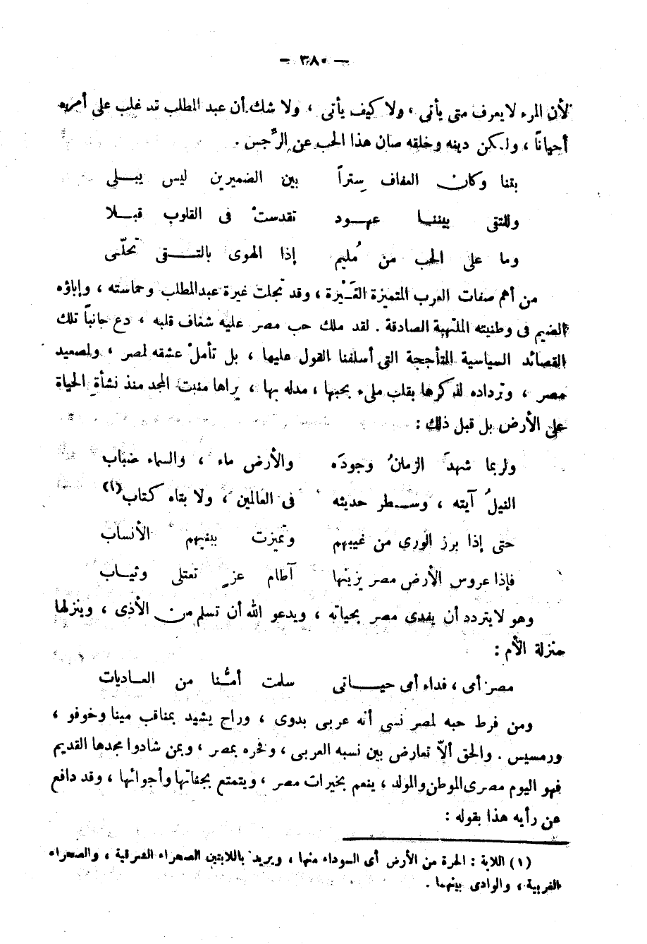 وقد ذكرنا في غير هذا الموضع موقف صبري من الأتراك والخلافة العثمانية، ومن الاحتلال، والحركة القومية ورجالها، ومن الخديو ورجاله2، وإن كانت قصيدته التي قالها حين اشتد الخلاف بين الأقباط وبين المسلمين3 في سنة 1911 تدل على بعد نظر، وحصانة رأي، لأن من مصلحة الأجنبي المستعمر