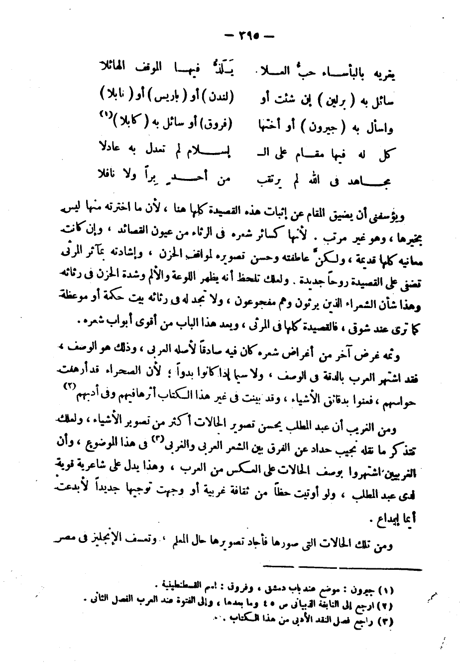وهاك شاعر آخر من شعراء المدرسة المحافظة على منهج العرب الأقدمين في شعرهم، يتميز عن إسماعيل صبري بعراقته في الدراسة العربية والدينية، وبأنه لم يتصل بالثقافة الغربية إلا عن طريق ما ترجم من الكتب، وقد كان قليلًا في الوقت الذي نضجت فيه شاعريته، وبأنه كان مبتديًا في خياله ومعانيه، وألفاظه، وطريقة حياته؛ وتسمع شعره فيخيل إليك أنك تسمع شاعرًا عربيًّا قديمًا عاش في العصر الأموي أو العباسي، بل يذكرك أحيانًا بشعراء العصر الجاهلي في متانة نسجه وإحكام قوافيه، وتشبيهاته واستعاراته المستمدة من حياة البادية.