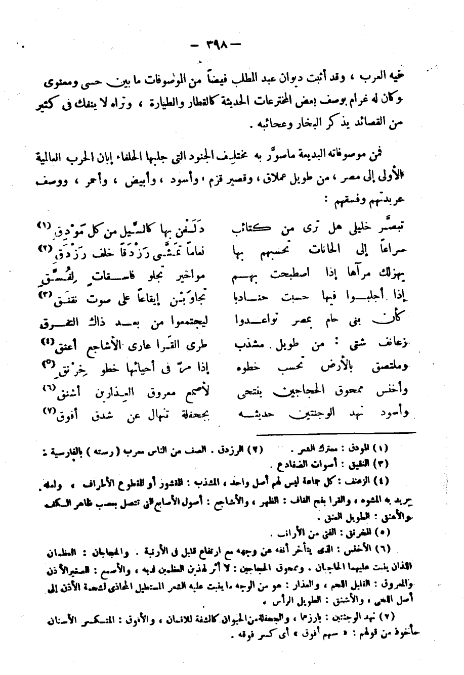ولا ينفك عبد المطلب يحدثك في كل قصيدة عن أمجاد قومه، وعن عظمة الأمة العربية التي ينتمي إليها، وهذا الشعور المتأصل في نفسه تأصل العقيدة هو الذي جعله يتشبث بمحاكاة الفحول المعرقين من شعراء العربية، ويود أن يصل إلى مرتبتهم متجاهلًا كل ما يتطلبه عصره وحضارته.