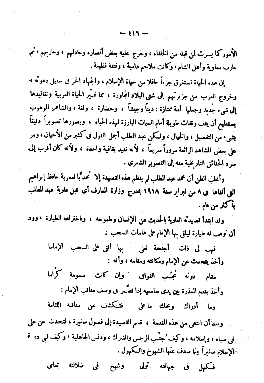 وإذا نظرنا إلى أغراضه وجدناه يقول في الأغراض المعروفة عند العرب من قبل، وإن كان قليل المديح؛ لأنه لم يك يرجو ثوابًا من أحد، أو يطمع من منصب، وليس من شعراء الحاشية وطبعه البدوي يربأ به عن الزلفى والنفاق، ولذلك لم يمدح إلا لفكرة، أو غاية سامية، وَجُلّ ثنائه على أصدقائه الذين أسدوا إليه جميلًا، وليس له في السطان عبد الحميد إلا قصيدة واحدة بمناسبة إعلان الدستور، وقد كان نافرًا من حكمه ينعى عليه استبداداه وجبروته، وقد ذم عهد عبد الحميد في قصيدة طويلة بعث بها إلى صديقه الشيخ عبد القادر المغربي، وكان مضطهدًا في عهد عبد الحميد وفيها أبيات تجري مجرى الأمثال، من هذا قوله: