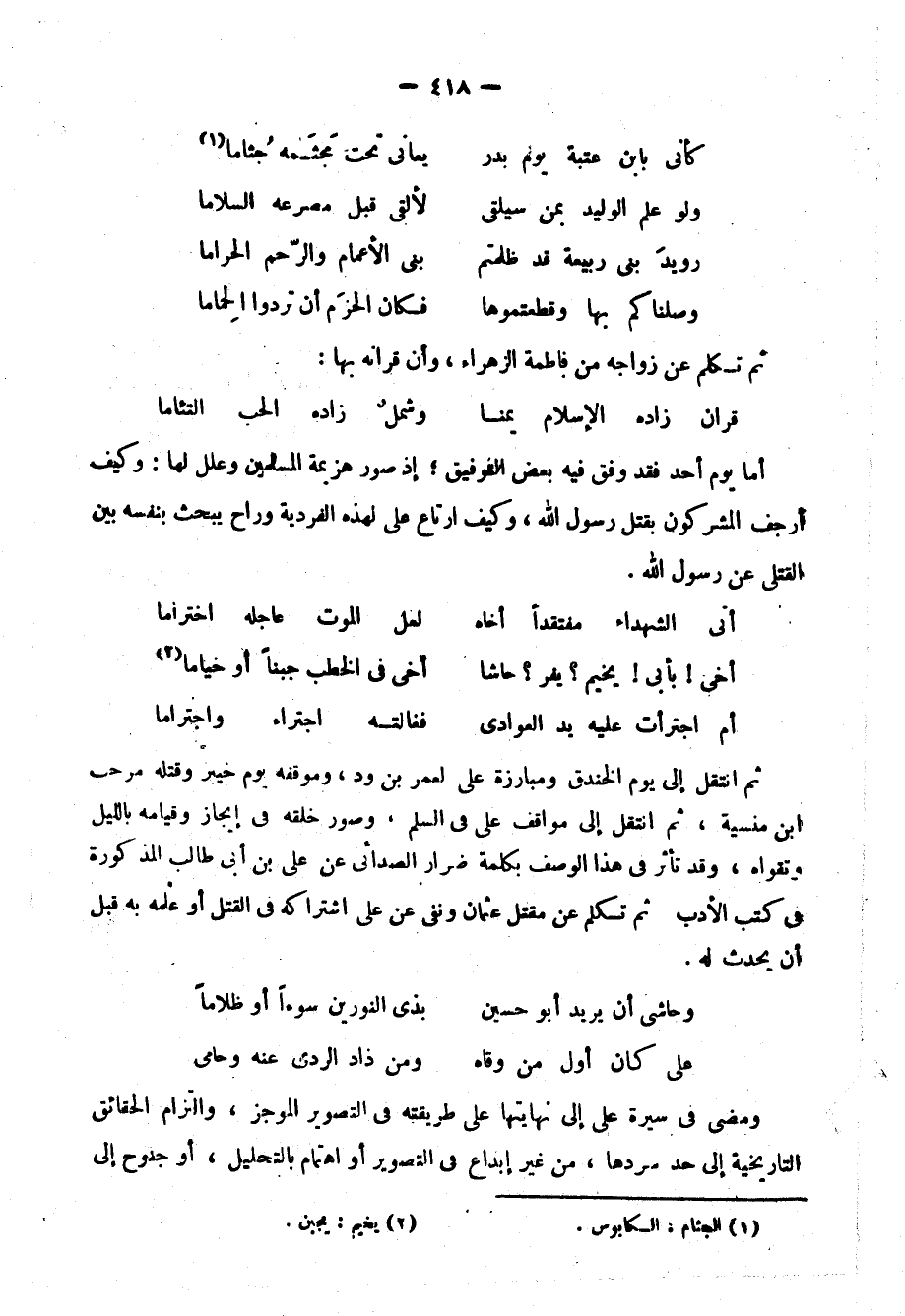 ويؤسفني أن يضيق المقام عن إثبات هذه القصيدة كلها هنا؛ لأن ما اخترته منها ليس بخيرها، وهو غير مرتب؛ لأنها كسائر شعره في الرثاء من عيون القصائد، وإن كانت معانيه كلها قديمة، ولكن عاطفته وحسن تصويره لمواقف الحزن، وإشادته بمآثر المرثي تضفي على القصيدة روحًا جديدة. ولعلك تلحظ أنه
