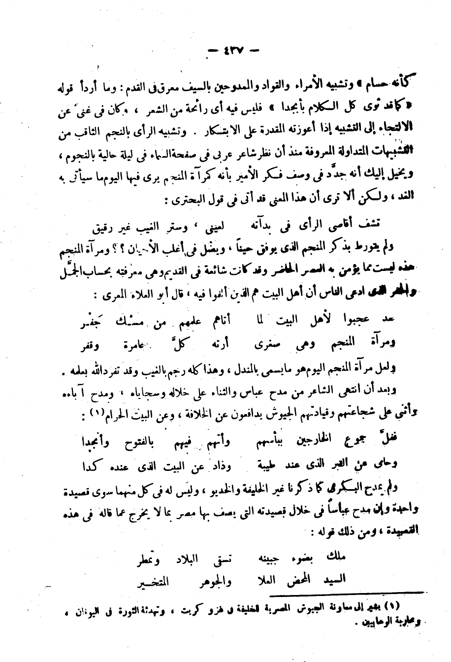إلى غير ذلك من المعاني التي يتطلبها الموقف. وله في سيد المرسلين قصيدة أخرى طويلة سماها "ظل البردة" ولعله تابع شوقي حين نظم "نهج البردة" فأبى إلا أن يحاكي بردة البوصيري مثله، وهذا ميدانه، وليس ميدان شوقي فقال: