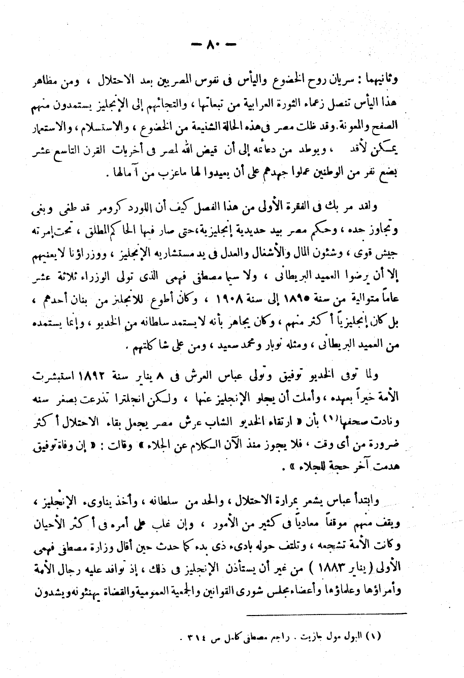 ثم اضطرمت الثورة في مصر سنة 1919، وكان من أهم أسبابها على ما أعتقده كبت الحريات، والتضييق الشديد على الآراء والأفكار طول عشرة سنوات كاملة، بل منذ خرج كرومر من مصر سنة 1906، ولقد كان كرومر استعماريًّا محنكًا، فسمح للمصريين بأن ينفسوا عن أنفسهم بالكتاب اوالخطابة فنأوا عن الثورة، وإن أطاحت به هذه الحرية التي منحها لهم وأبعدته عن مصر على أثر تلك الغارة الشعواء التي شنوها عليه بعد حادثة دنشواي الدامية، أما خلفاؤه فلم ينهجوا نهجه، ولم يتمرسوا بحكم الشعوب، ويدرسوا نفسياتها ويعالجوها بما يناسبها، فكانت ثورة 1919، وكانت خيرًا وبركة على وادي النيل.