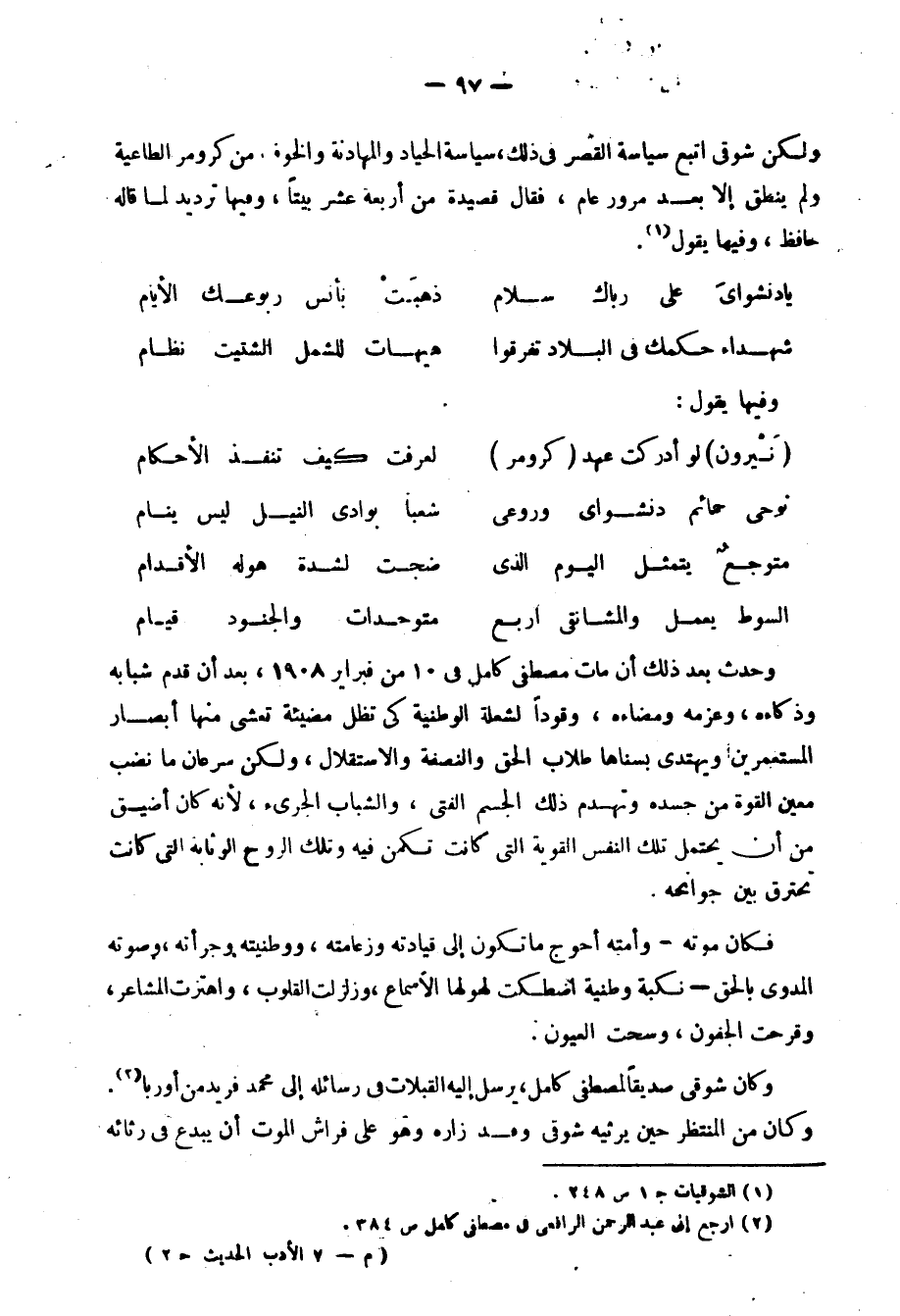 2 ديوان حافظ ج1 ص44 وقد قالها مهنئًا بعيد جلوسه 1908 بعد إعلان الدستور العثماني.