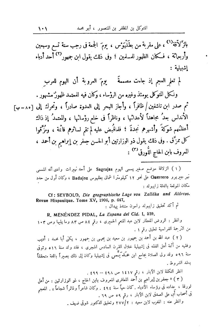 بالزّلاّقة على مقربة من بطليوس يَوْم الْجُمُعَة فِي رَجَب سنة تسع وَسبعين وَأَرْبَعمِائَة فَكَانَ الظُّهُور للْمُسلمين وَفِي ذَلِك يَقُول ابْن جُمْهُور أحد أدباء إشبيلية