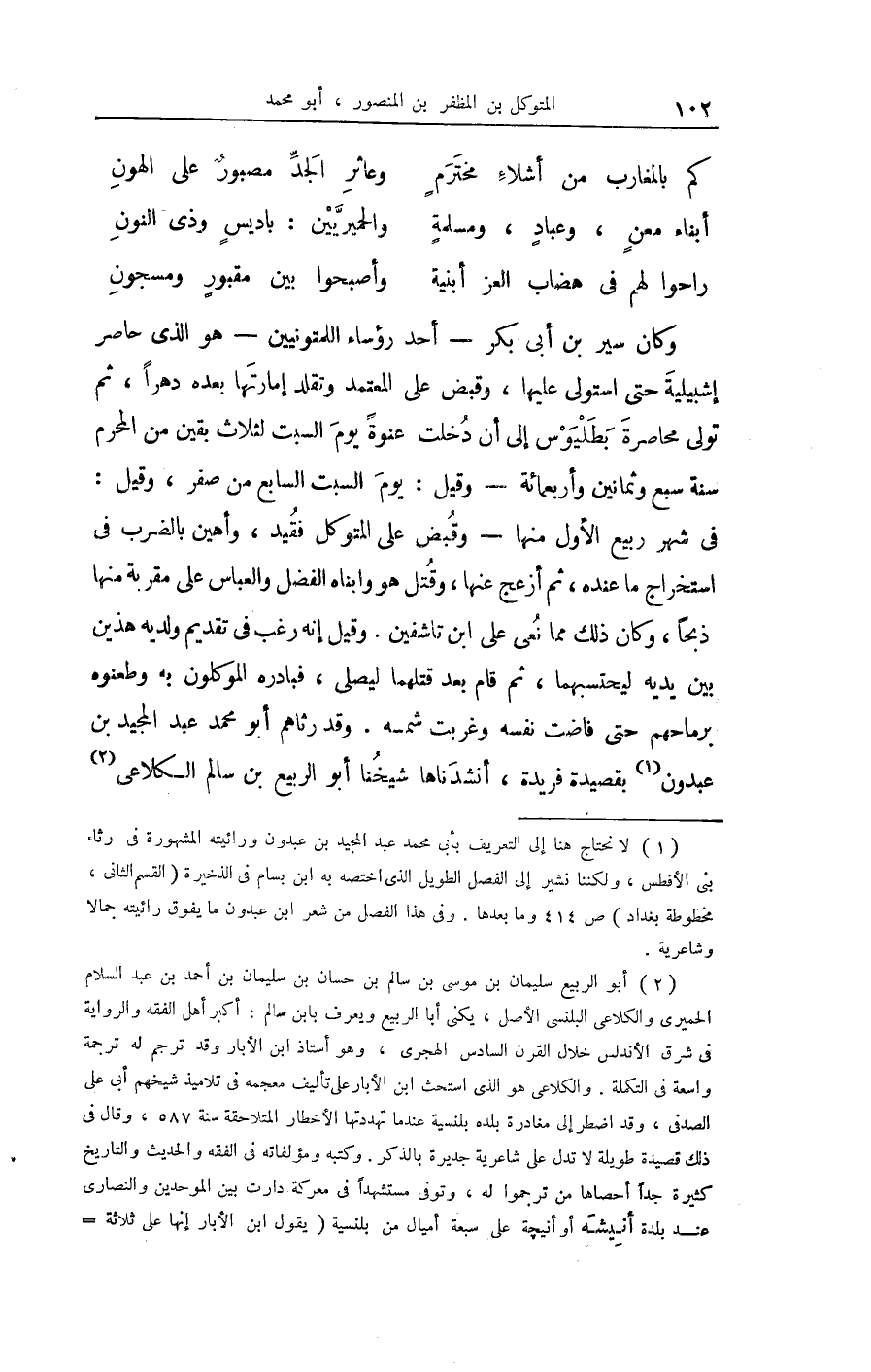 وَكَانَ سير بن أبي بكر أحد رُؤَسَاء اللمتونيين هُوَ الَّذِي حاصر إشبيلية حَتَّى استولى عَلَيْهَا وَقبض على الْمُعْتَمد وتقلد إمارتها بعده دهراً ثمَّ تولى محاصرة بطليوس إِلَى أَن دخلت عنْوَة يَوْم السبت لثلاث بَقينَ من الْمحرم سنة سبع وَثَمَانِينَ وَأَرْبَعمِائَة وَقيل يَوْم السبت السَّابِع من صفر وَقيل فِي شهر ربيع الأول مِنْهَا وَقبض على المتَوَكل فقيد وأهين بِالضَّرْبِ فِي اسْتِخْرَاج مَا عِنْده ثمَّ أزعج عَنْهَا وَقتل هُوَ وابناه الْفضل وَالْعَبَّاس على مقربة مِنْهَا ذبحا وَكَانَ ذَلِك مِمَّا نعي على ابْن تاشفين وَقيل إِنَّه رغب فِي تَقْدِيم ولديه هذَيْن بَين يَدَيْهِ ليحتسبهما ثمَّ قَامَ بعد قَتلهمَا ليُصَلِّي فبادره الموكلون بِهِ وطعنوه برماحهم حَتَّى فاضت نَفسه وغربت شمسه وَقد رثاهم أَبُو مُحَمَّد عبد الْمجِيد بن عبدون بقصيدة فريدة أنشدناها شَيخنَا أَبُو الرّبيع بن سَالم الكلَاعِي