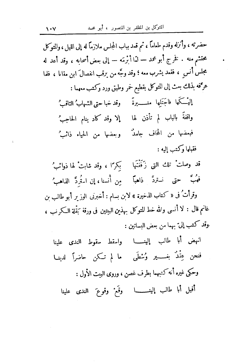 حَضرته وأنزله وَقدم طَعَاما ثمَّ قعد بِبَاب الْمجْلس ملازماً لَهُ إِلَى اللَّيْل والمتوكل محتشم مِنْهُ فَخرج أَبُو مُحَمَّد لمّا أبرمه إِلَى بعض أَصْحَابه وَقد أعد لَهُ مجْلِس أنس فَقعدَ يشرب مَعَه وَقد وجّه من يرقب انْفِصَال ابْن مقانا فَلَمَّا عرّفه بذلك بعث إِلَى المتَوَكل بقطيع خمر وطبق ورد وَكتب مَعَهُمَا