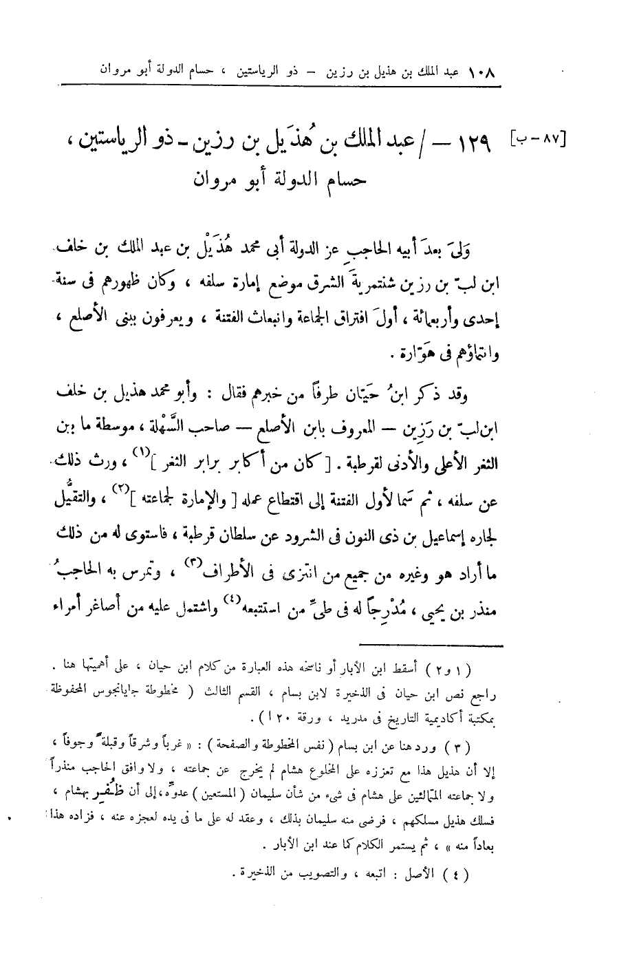 129 - عبد الْملك بن هُذَيْل بن رزين ذُو الرياستين حسام الدولة أَبُو مَرْوَان