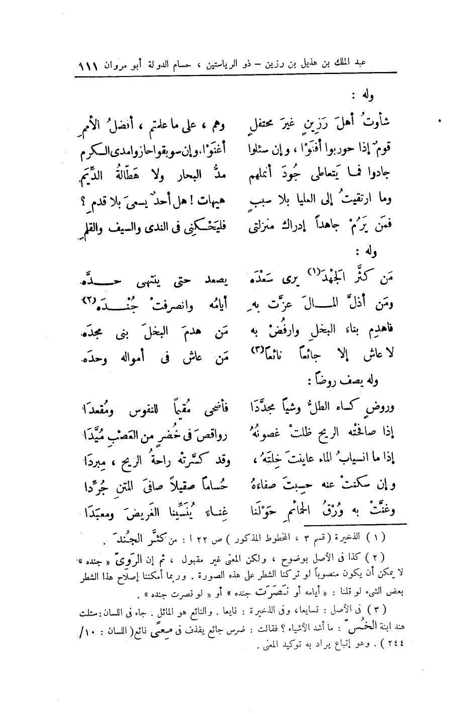 (وَمن أذلّ المَال عزّت بِهِ ... أَيَّامه وانصرفت جنده)