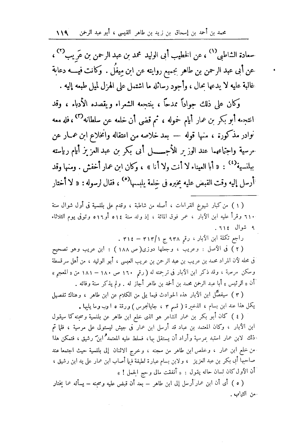 وَكَانَ على ذَلِك جواداً ممدحاً ينتجعه الشُّعَرَاء ويقصده الأدباء وَقد انتجعه أَبُو بكر بن عمار أَيَّام خموله ثمَّ قضى أَن خلعه عَن سُلْطَانه فَلهُ مَعَه نَوَادِر مَذْكُورَة مِنْهَا قَوْله بعد خُلَاصَة من اعتقاله وانخلاع ابْن عمار عَن مرسية واجتماعهما عِنْد الْوَزير الْأَجَل أبي بكر بن عبد الْعَزِيز أَيَّام رياسته ببلنسية أَبَا العيناء لَا أَنْت وَلَا أَنا وَكَانَ ابْن عمار أخفش وَمِنْهَا وَقد أرسل إِلَيْهِ وَقت الْقَبْض عَلَيْهِ يخيره فِي خلعة يلبسهَا فَقَالَ لرَسُوله لَا أخْتَار