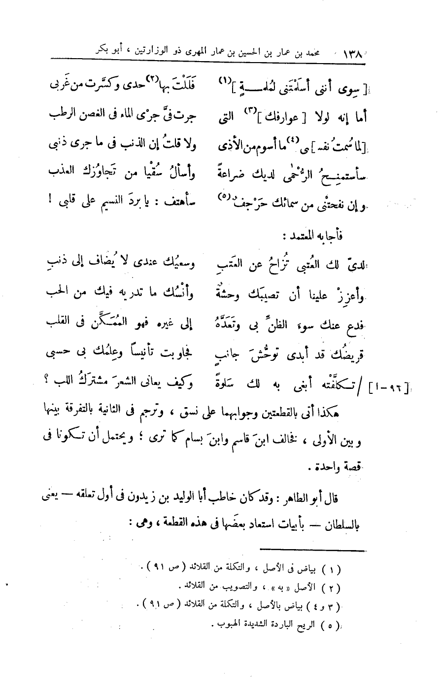 سوى أنني أسلمتني لملمة فللت بهَا حدي وكسّرت من غربي أما إِنَّه لَوْلَا عوارفك الَّتِي جرت فِي جري المَاء فِي الْغُصْن الرطب لما سمت نَفسِي مَا أسوم من الْأَذَى وَلَا قلت إِن الذَّنب فِي مَا جرى ذَنبي سأستمنح الرحمى لديك ضراعة وأسأل سقيا من تجاوزك العذب وَإِن نفحتني من سمائك وحرجف سأهتف يَا برد النسيم على قلبِي فَأَجَابَهُ الْمُعْتَمد لديّ لَك العتبى تزاح عَن العتب وسعيك عِنْدِي لَا يُضَاف إِلَى ذَنْب وأعزز علينا أَن تصيبك وَحْشَة وأنسك مَا تدريه فِيك من الْحبّ فدع عَنْك سوء الظنّ بِي وتعدّه إِلَى غَيره فَهُوَ الممكّن فِي الْقلب قريضك قد أبدى توحّش جَانب فجاوبت تأنيساً وعلمك بِي حسبي تكلّفته أبغي بِهِ لَك سلوة وَكَيف يعاني الشّعْر مُشْتَرك اللب هَكَذَا أَتَى بالقطعتين وجوابهما على نسق وَترْجم فِي الثَّانِيَة بالتفرقة بَينهمَا وَبَين الأولى فَخَالف ابْن قَاسم وَابْن بسام كَمَا ترى وَيحْتَمل أَن تَكُونَا فِي قصَّة وَاحِدَة قَالَ أَبُو الطَّاهِر وَقد كَانَ خَاطب أَبَا الْوَلِيد بن زيدون فِي أول تعلقه يَعْنِي بالسطان بِأَبْيَات استعاد بَعْضهَا فِي هَذِه الْقطعَة وَهِي