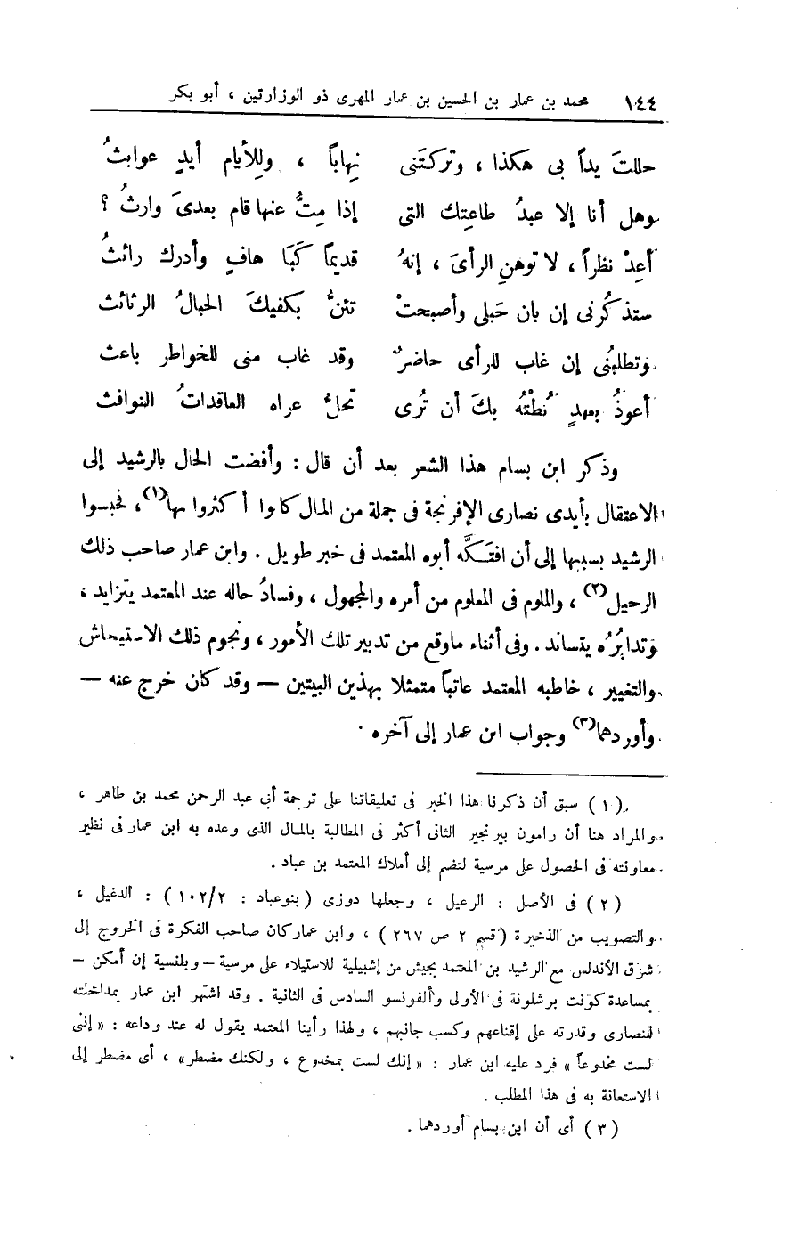 وَذكر ابْن بسام هَذَا الشّعْر بعد أَن قَالَ وأفضت الْحَال بالرشيد إِلَى الاعتقال بأيدي نَصَارَى الإفرنجة فِي جملَة من المَال كَانُوا أَكْثرُوا بهَا فَحَسبُوا الرشيد بِسَبَبِهَا إِلَى أَن افتكّه أَبوهُ الْمُعْتَمد فِي خبر طَوِيل وَابْن عمار صَاحب ذَلِك الرحيل والملوم فِي الْمَعْلُوم من أمره والمجهول وَفَسَاد حَاله عِنْد الْمُعْتَمد يتزايد وتدابره يتساند وَفِي أثْنَاء مَا وَقع من تَدْبِير تِلْكَ الْأُمُور ونجوم ذَلِك الاستيحاش والتغيير خاطبه الْمُعْتَمد عاتباً متمثلاً بِهَذَيْنِ الْبَيْتَيْنِ وَقد كَانَ خرج عَنهُ وأوردهما وَجَوَاب ابْن عمار إِلَى آخِره