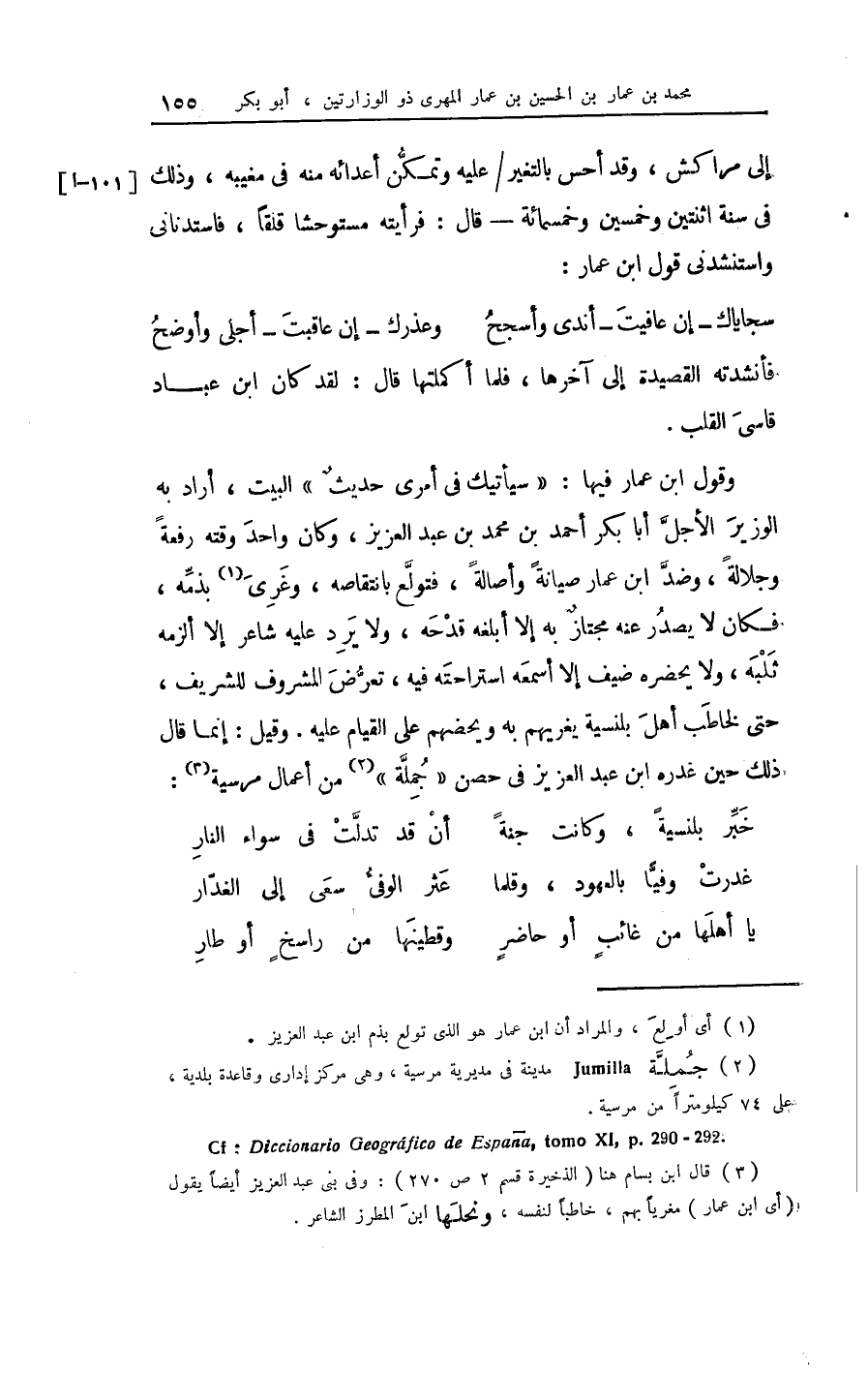 وَقَول ابْن عمار فِيهَا سيأتيك فِي أَمْرِي حَدِيث الْبَيْت أَرَادَ بِهِ الْوَزير الأجلّ أَبَا بكر أَحْمد بن مُحَمَّد بن عبد الْعَزِيز وَكَانَ وَاحِد وقته رفْعَة وجلالة وضدّ ابْن عمار صِيَانة وأصالة فتولّع بانتقاصه وغرى بذمّه فَكَانَ لَا يصدر عَنهُ مجتاز بِهِ إِلَّا أبلغه قدحه وَلَا يرد عَلَيْهِ شَاعِر إِلَّا ألزمهُ ثلبه وَلَا يحضرهُ ضيف إِلَّا أسمعهُ استراحته فِيهِ تعرّض المشروف للشريف حَتَّى لخاطب أهل بلنسية يغريهم بِهِ ويحضهم على الْقيام عَلَيْهِ وَقيل إِنَّمَا قَالَ ذَلِك حِين غدره ابْن عبد الْعَزِيز فِي حصن جملّة من أَعمال مرسية