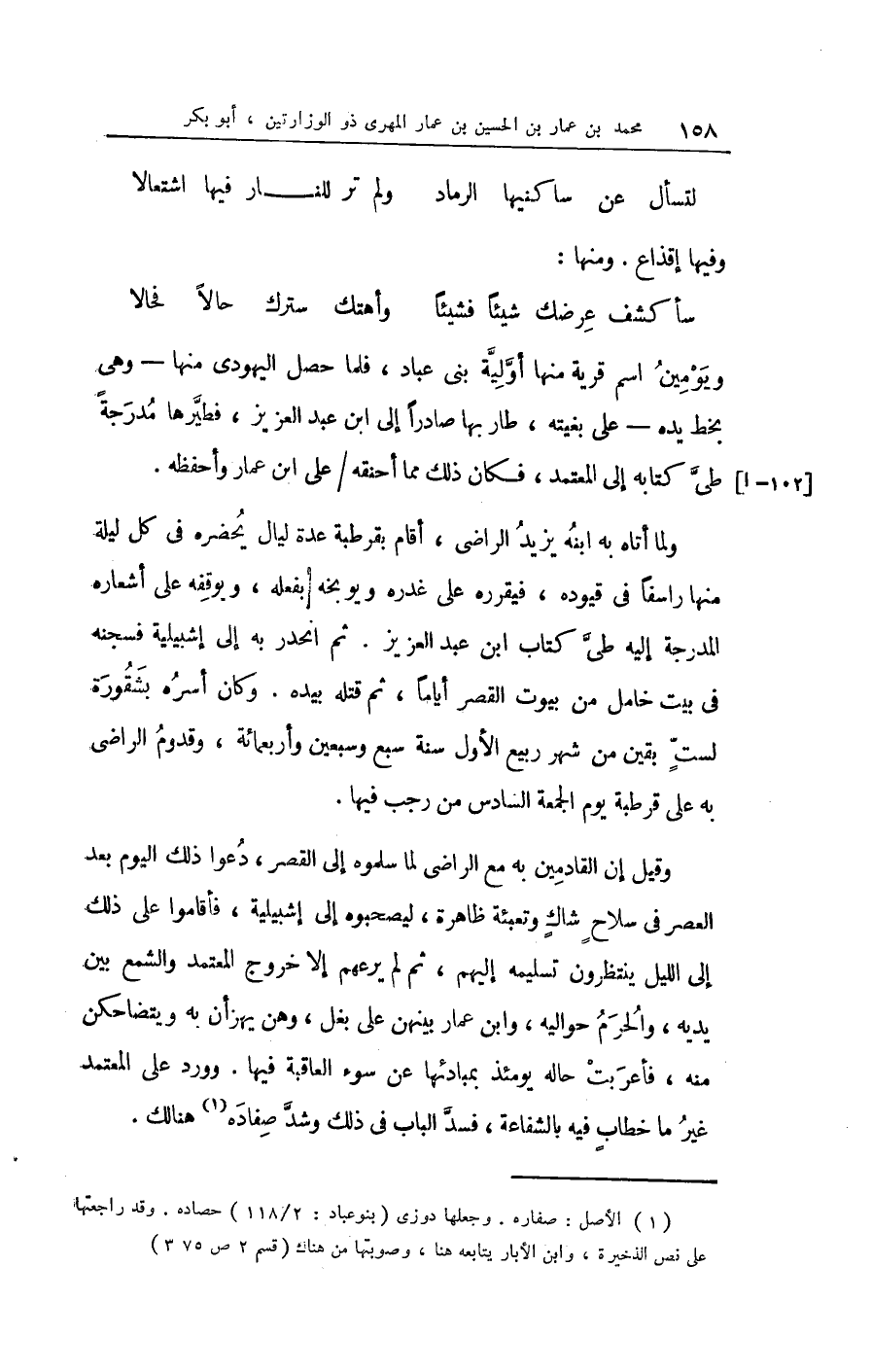 ويومين اسْم قَرْيَة مِنْهَا أوّليّة بني عباد فَلَمَّا حصل الْيَهُودِيّ مِنْهَا وَهِي بِخَط يَده على بغيته طَار بهَا صادراً إِلَى ابْن عبد الْعَزِيز فطيّرها مدرجة طيّ كِتَابه إِلَى الْمُعْتَمد فَكَانَ ذَلِك مِمَّا أحنقه على ابْن عمار وأحفظه