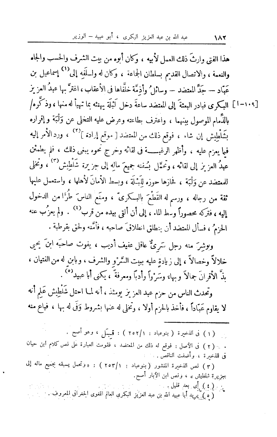 هَذَا الْفَتى وَارِث ذَلِك الْعَمَل لِأَبِيهِ وَكَانَ أَبوهُ من بَيت الشّرف والحسب والجاه وَالنعْمَة والاتصال الْقَدِيم بسُلْطَان الْجَمَاعَة وَكَانَ لَهُ ولسلفه إِلَى إِسْمَاعِيل بن عبّاد جدّ المعتضد وَسَائِل وأذمّة خلّفاها فِي الأعقاب اغترّ بهَا عبد الْعَزِيز الْبكْرِيّ فبادر الْبعْثَة إِلَى المعتضد سَاعَة دخل لبلة يهنئه بِمَا تهَيَّأ لَهُ مِنْهَا وذكّره بالذّمام الْمَوْصُول بَينهمَا واعترف بِطَاعَتِهِ وَعرض عَلَيْهِ التخلي عَن ولبة وَإِقْرَاره بشلطيش إِن شَاءَ فَوَقع ذَلِك من المعتضد موقع إِرَادَة ورد الْأَمر إِلَيْهِ فِيمَا يعزم عَلَيْهِ وَأظْهر الرَّغْبَة فِي لِقَائِه وَخرج نَحوه يَبْغِي ذَلِك فَلم يطمئن عبد الْعَزِيز إِلَى لِقَائِه وتحمّل بسفنه جَمِيع مَاله إِلَى جَزِيرَة شلطيش وتخلى للمعتضد عَن ولبة فحازها حوزه للبلة وَبسط الْأمان لأَهْلهَا وَاسْتعْمل عَلَيْهَا ثِقَة من رِجَاله ورسم لَهُ الْقطع بالبكري وَمنع النَّاس طراًّ من الدُّخُول إِلَيْهِ فَتَركه محصوراً وسط المَاء إِلَى أَن ألْقى بِيَدِهِ من قرب وَلم يعزب عَنهُ الحزم فَسَأَلَ المعتضد أَن ينْطَلق انطلاق صَاحبه فأمّنه وَلحق بقرطبة