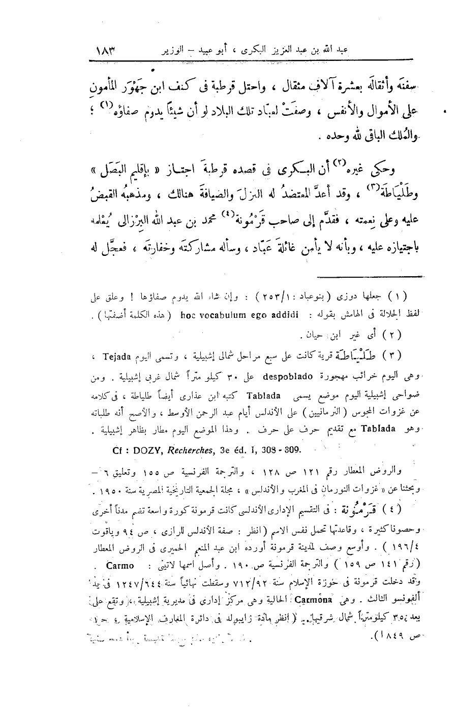 وَحكى غَيره أَن الْبكْرِيّ فِي قَصده قرطبة اجتاز بإقليم البصل وطلياطة وَقد أعدّ المعتضد لَهُ النزل والضيافة هُنَالك ومذهبه الْقَبْض عَلَيْهِ وعَلى نعْمَته فقدّم إِلَى صَاحب قرمونة مُحَمَّد بن عبد الله البرزالي يُعلمهُ باجتيازه عَلَيْهِ وَبِأَنَّهُ لَا يَأْمَن غائلة عبّاد وَسَأَلَهُ مشاركته وخفارته فعجّل لَهُ