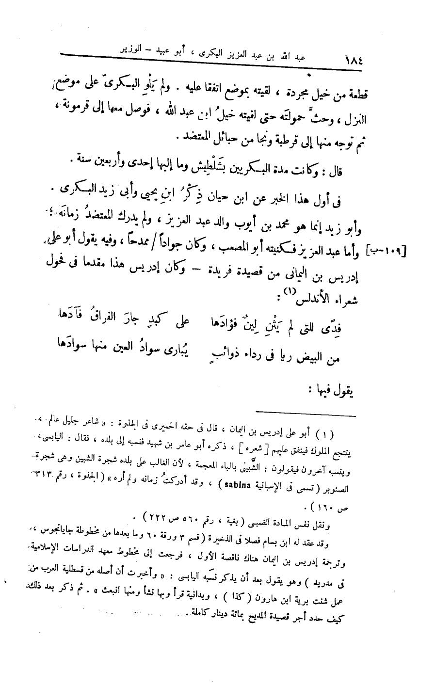 وَأَبُو زيد إِنَّمَا هُوَ مُحَمَّد بن أَيُّوب وَالِد عبد الْعَزِيز وَلم يدْرك المعتضد زَمَانه وَأما عبد الْعَزِيز فكنيته أَبُو المصعب وَكَانَ جواداً ممدحاً وَفِيه يَقُول أَبُو عَليّ إِدْرِيس بن الْيَمَانِيّ من قصيدة فريدة وَكَانَ إِدْرِيس هَذَا مقدما فِي فحول شعراء الأندلس
