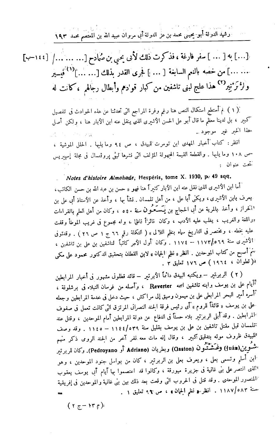 .. . بِهِ ... سفر فارغة فَذكرت ذَلِك لأبي يحيى بن صمادج ... من خصّه بِالنعَم السابغة ... فَجرى الْقدر بذلك ... فيسير والربرتير هَذَا علج لبني تاشفين من كبار قوادهم وأبطال رِجَالهمْ كَانَت لَهُ