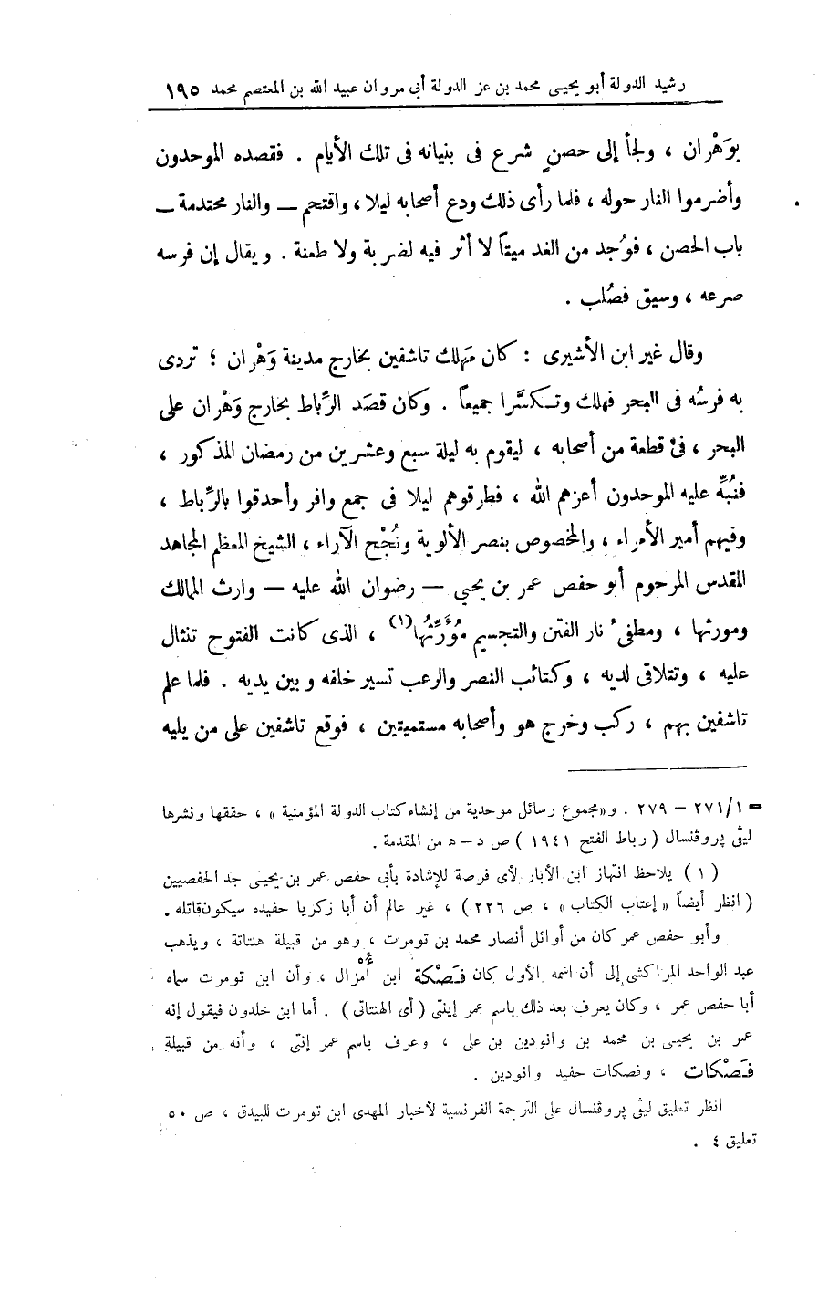 وَقَالَ غير ابْن الأشيري كَانَ مهلك تاشفين بِخَارِج مَدِينَة وهران تردى بِهِ فرسه فِي الْبَحْر فَهَلَك وتكسّرا جَمِيعًا وَكَانَ قصد الرّباط بِخَارِج وهران على الْبَحْر فِي قِطْعَة من أَصْحَابه ليقوم بِهِ لَيْلَة سبع وَعشْرين من رَمَضَان الْمَذْكُور فنبّه عَلَيْهِ الموحدون أعزهم الله فطرقوهم لَيْلًا فِي جمع وافر وَأَحْدَقُوا بالرّباط وَفِيهِمْ أَمِير الْأُمَرَاء والمخصوص بنصر الْأَوْلَوِيَّة ونجح الآراء الشَّيْخ الْمُعظم الْمُجَاهِد الْمُقَدّس المرحوم أَبُو حَفْص عمر بن يحيى رضوَان الله عَلَيْهِ وراث الممالك ومورثها ومطفئ نَار الْفِتَن والتجسيم مؤرّثها الَّذِي كَانَت الْفتُوح تنثال عَلَيْهِ وتتلاقي لَدَيْهِ وكتائب النَّصْر والرعب تسير خَلفه وَبَين يَدَيْهِ