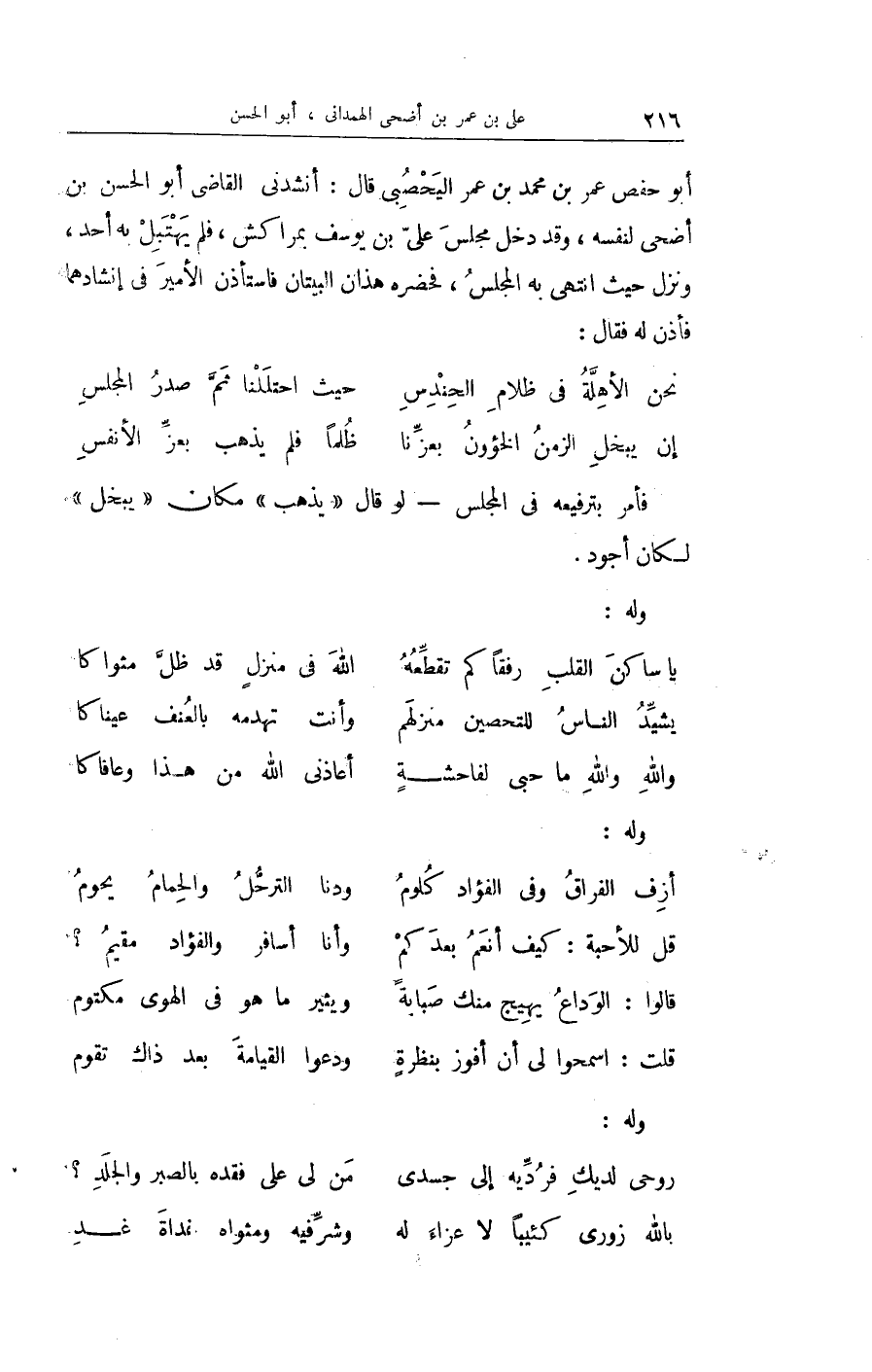 أَبُو حَفْص عمر بن مُحَمَّد بن عمر الْيحصبِي قَالَ أَنْشدني القَاضِي أَبُو الْحسن بن أضحى لنَفسِهِ وَقد دخل مجْلِس عليّ بن يُوسُف بمراكش فَلم يهتبل بِهِ أحد وَنزل حَيْثُ انْتهى بِهِ الْمجْلس فحضره هَذَانِ البيتان فَاسْتَأْذن الْأَمِير فِي إنشادهما فَأذن لَهُ فَقَالَ