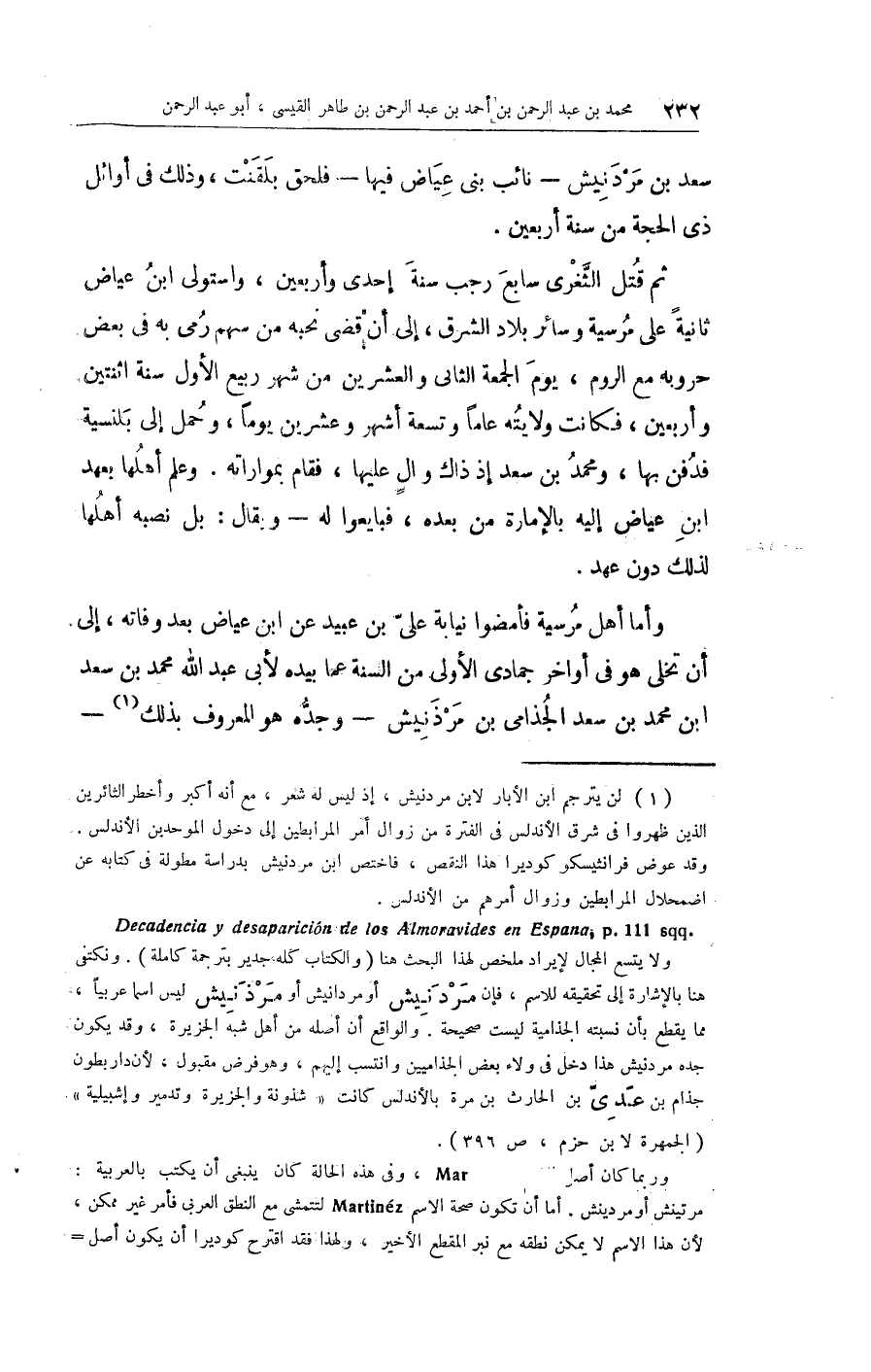 وَأما أهل مرسية فأمضوا نِيَابَة عليّ بن عبيد عَن ابْن عِيَاض بعد وَفَاته إِلَى أَن تخلى هُوَ فِي أَوَاخِر جُمَادَى الأولى من السّنة عَمَّا بِيَدِهِ لأبي عبد الله مُحَمَّد بن سعد ابْن مُحَمَّد بن سعد الجذامى بن مرذنيش وجدّه هُوَ الْمَعْرُوف بذلك