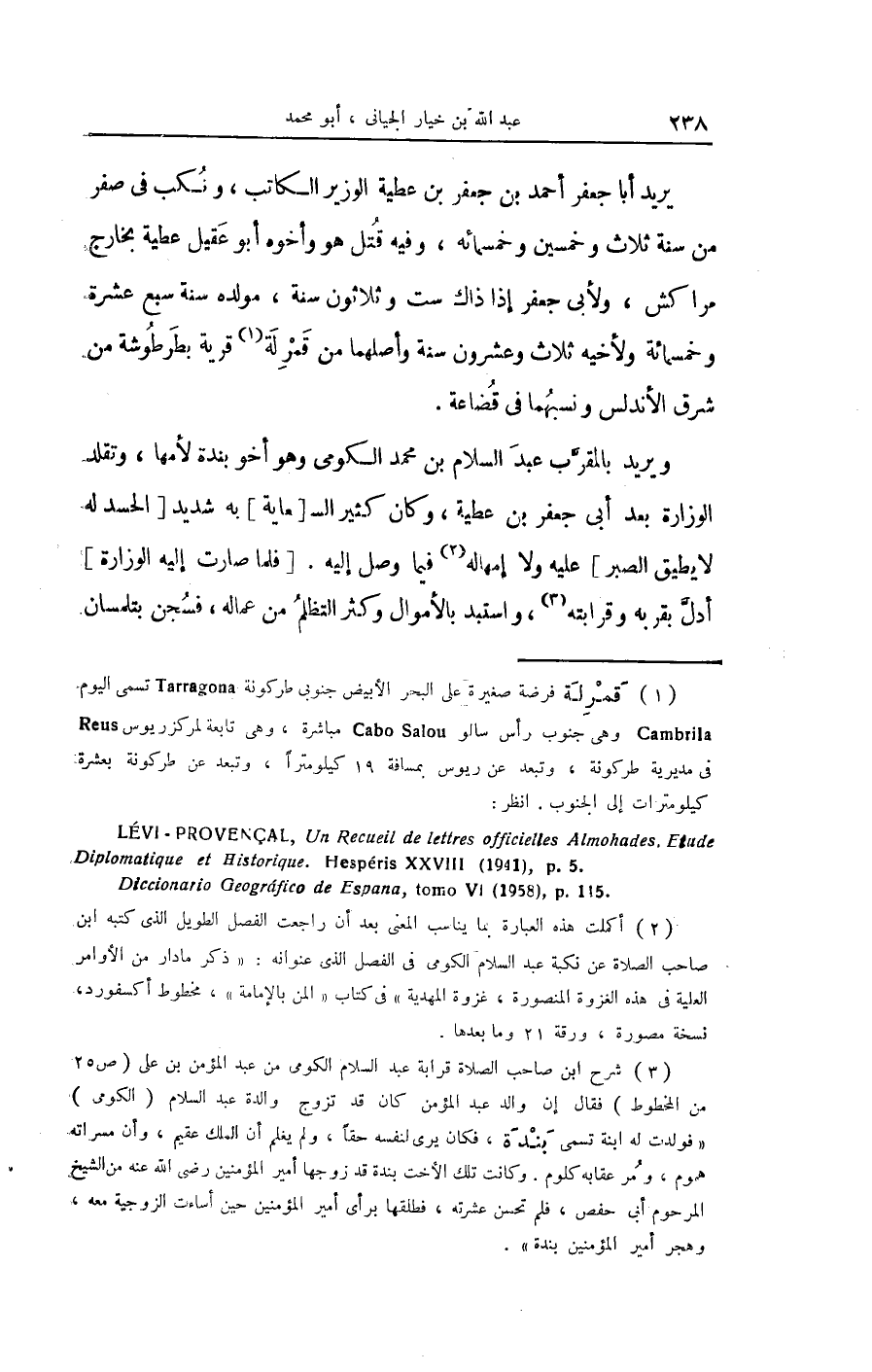يُرِيد أَبَا جَعْفَر أَحْمد بن جَعْفَر بن عَطِيَّة الْوَزير الْكَاتِب ونكب فِي صفر من سنة ثَلَاث وَخمسين وَخَمْسمِائة وَفِيه قتل هُوَ وَأَخُوهُ أَبُو عقيل عَطِيَّة بِخَارِج مراكش وَلأبي جَعْفَر إِذا ذَاك سِتّ وَثَلَاثُونَ سنة مولده سنة سبع عشرَة وَخَمْسمِائة ولأخيه ثَلَاث وَعِشْرُونَ سنة وأصلهما من قمرلة قَرْيَة بطرطوشة من شَرق الأندلس ونسبهما فِي قضاعة