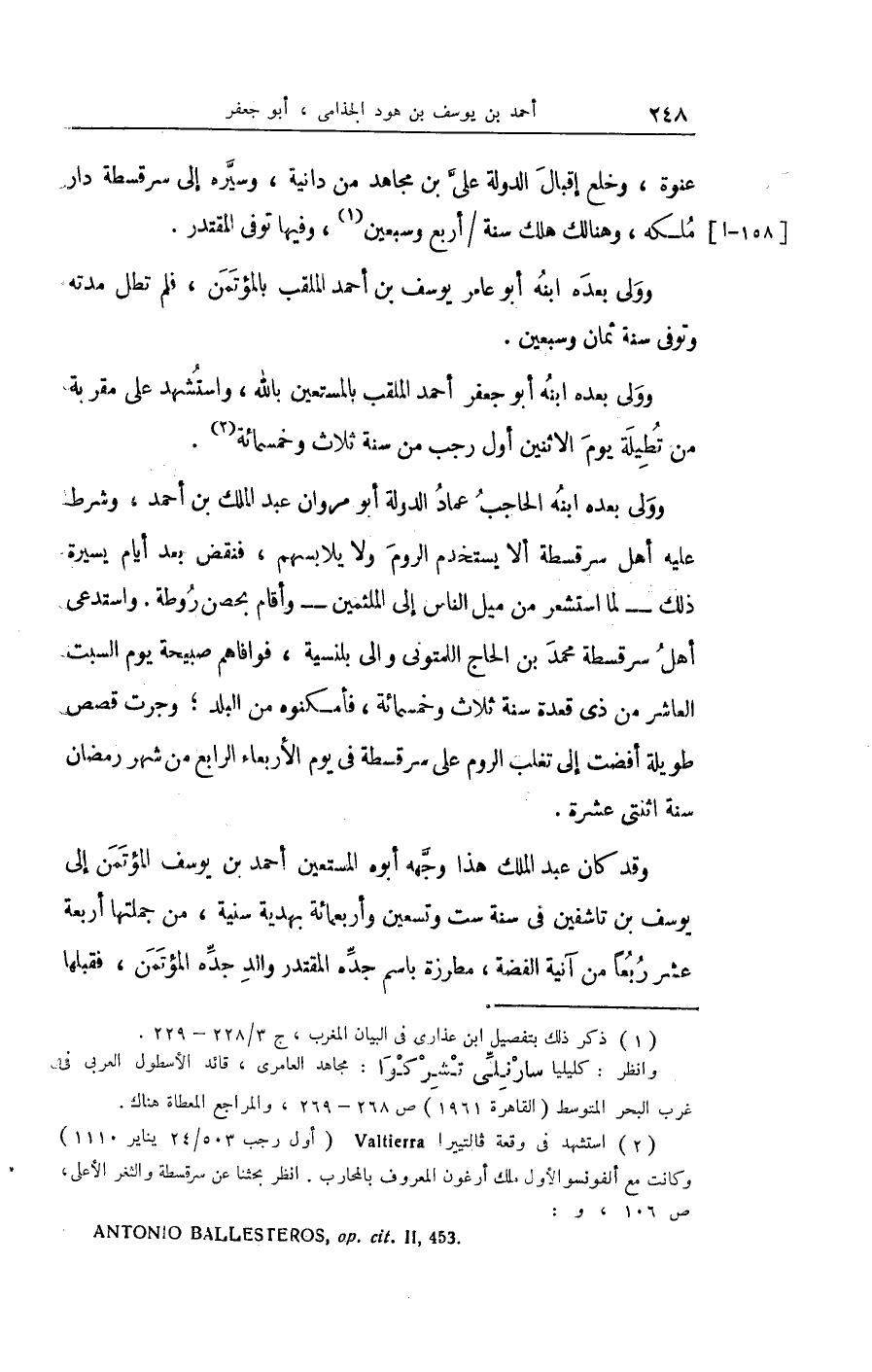 وَولى بعده ابْنه أَبُو جَعْفَر أَحْمد الملقب بالمستعين بِاللَّه وَاسْتشْهدَ على مقربة من تطيلة يَوْم الِاثْنَيْنِ أول رَجَب من سنة ثَلَاث وَخَمْسمِائة
