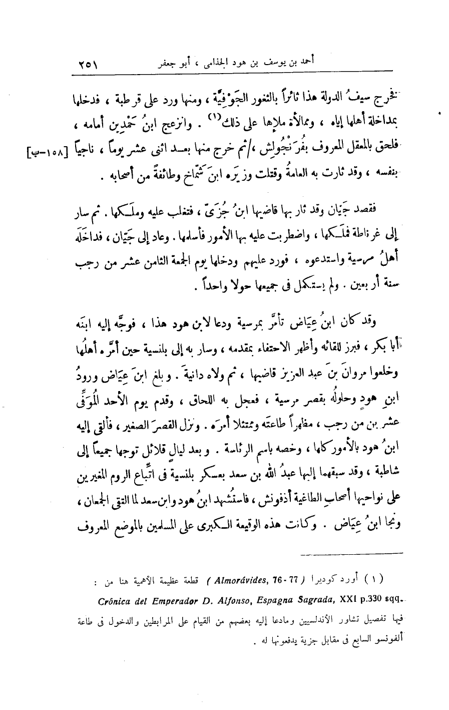 وَقد كَانَ ابْن عِيَاض تأمّر بمرسية ودعا لِابْنِ هود هَذَا فوجّه إِلَيْهِ ابْنه أَبَا بكر فبرز للقائه وَأظْهر الاحتفاء بمقدمه وَسَار بِهِ إِلَى بلنسية حِين أمّره أَهلهَا وخلعوا مَرْوَان بن عبد الْعَزِيز قاضيها ثمَّ ولاه دانية وَبلغ ابْن عِيَاض وُرُود ابْن هود وحلوله بقصر مرسية فَعجل بِهِ اللحاق وَقدم يَوْم الْأَحَد الموفّى عشْرين من رَجَب مظْهرا طَاعَته وممتثلاً أمره وَنزل الْقصر الصَّغِير فَألْقى إِلَيْهِ ابْن هود بالأمور كلهَا وَخَصه باسم الرِّئَاسَة وَبعد لَيَال قَلَائِل توجها جَمِيعًا إِلَى شاطبة وَقد سبقهما إِلَيْهَا عبد الله بن سعد بعسكر بلنسية فِي اتّباع الرّوم المغيرين على نَوَاحِيهَا أَصْحَاب الطاغية أذفونش فاستشهد ابْن هود وَابْن سعد لما التقى الْجَمْعَانِ وَنَجَا ابْن عِيَاض وَكَانَت هَذِه الوقيعة الْكُبْرَى على الْمُسلمين بالموضع الْمَعْرُوف