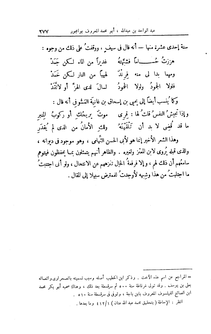 وَهَذَا الشّعْر الْأَخير إِنَّمَا هُوَ لأبي الْحسن التّهامي وَهُوَ مَوْجُود فِي ديوانه وَالَّذِي قبله يروي لِابْنِ المعتز وَلغيره وَالظَّاهِر أَنهم يتمثلون بِمَا يحفظون فيتوهم سامعهم أَن ذَلِك لَهُم وَإِلَّا فرفعة الْحَال تنزههم عَن الانتحال وَلَو أَنِّي اجْتنبت مَا اجتلبت من هَذَا وَشبهه لأوجدت للمعترض سَبِيلا إِلَى الْمقَال