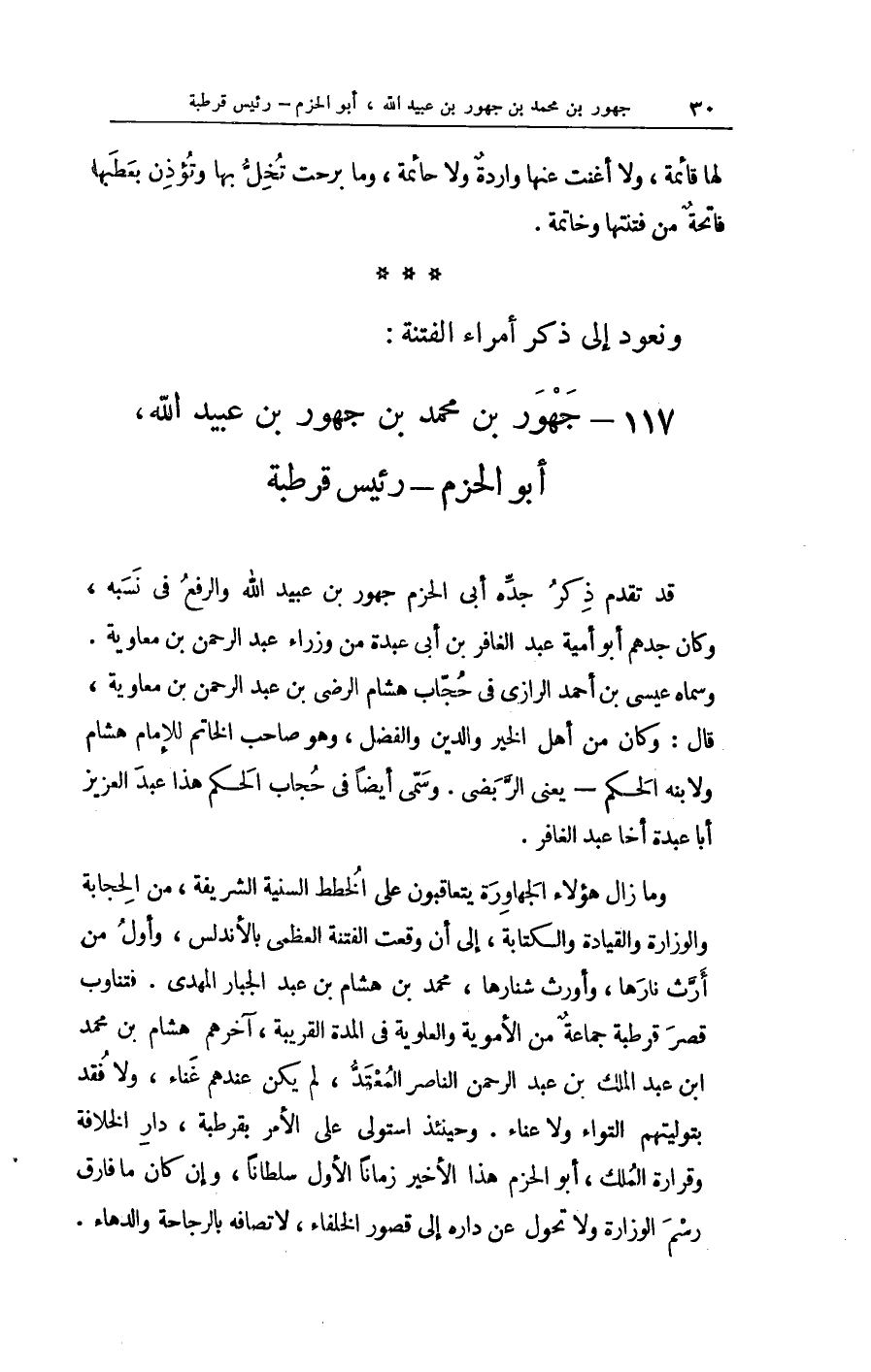 وَمَا زَالَ هَؤُلَاءِ الجهاورة يتعاقبون على الخطط السّنيَّة الشَّرِيفَة من الحجابة والوزارة والقيادة وَالْكِتَابَة إِلَى أَن وَقعت الْفِتْنَة الْعُظْمَى بالأندلس وَأول من أرّث نارها وأورث شنارها مُحَمَّد بن هِشَام بن عبد الْجَبَّار الْمهْدي فتناوب قصر قرطبة جمَاعَة من الأموية والعلوية فِي الْمدَّة الْقَرِيبَة آخِرهم هِشَام بن مُحَمَّد ابْن عبد الْملك بن عبد الرَّحْمَن النَّاصِر المعتدّ لم يكن عِنْدهم غناء وَلَا فقد بتوليتهم التواء وَلَا عناء وَحِينَئِذٍ استولى على الْأَمر بقرطبة دَار الْخلَافَة وقرارة الْملك أَبُو الحزم هَذَا الْأَخير زَمَانا الأول سُلْطَانا وَإِن كَانَ مَا فَارق رسم الوزارة وَلَا تحول عَن دَاره إِلَى قُصُور الْخُلَفَاء لَا تصافه بالرجاحة والدهاء