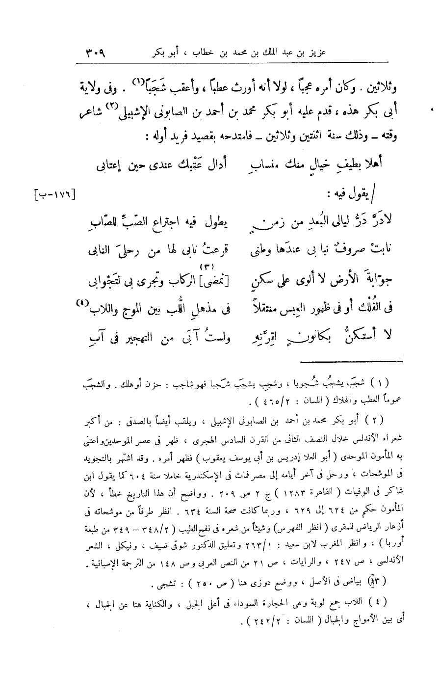 وَثَلَاثِينَ وَكَانَ أمره عجبا لَوْلَا أَنه أورث عطباً وأعقب شجباً وَفِي ولَايَة أبي بكر هَذِه قدم عَلَيْهِ أَبُو بكر مُحَمَّد بن أَحْمد بن الصَّابُونِي الإشبيلي شَاعِر وقته وَذَلِكَ سنة اثْنَتَيْنِ وَثَلَاثِينَ فامتدحه بقصيد فريد أَوله